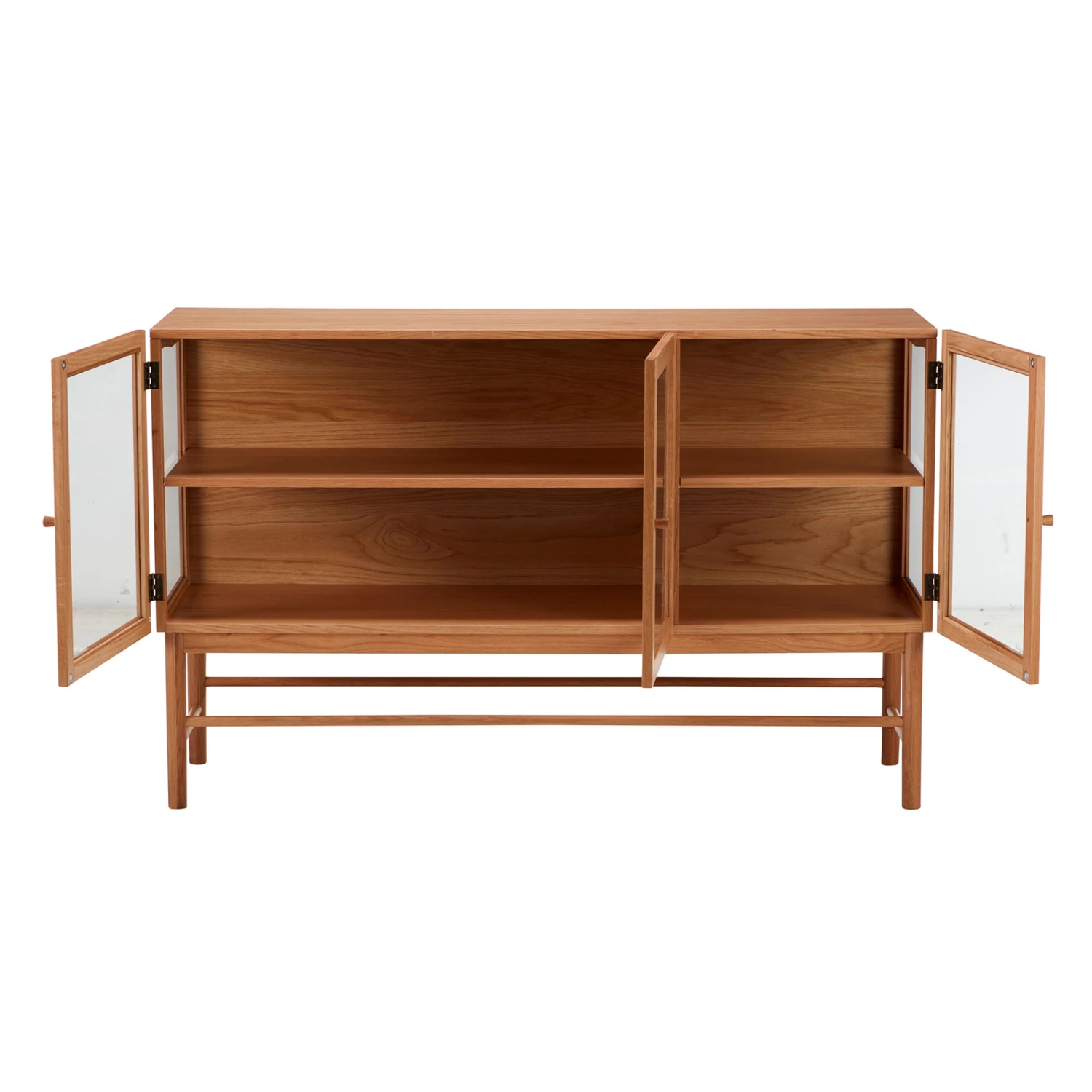 Display your favourite dining room accessories while keeping them protected in this minimalist natural oak veneer sideboard. Beautifully crafted with three sleek glass doors to optimise space and one large shelf for storage.