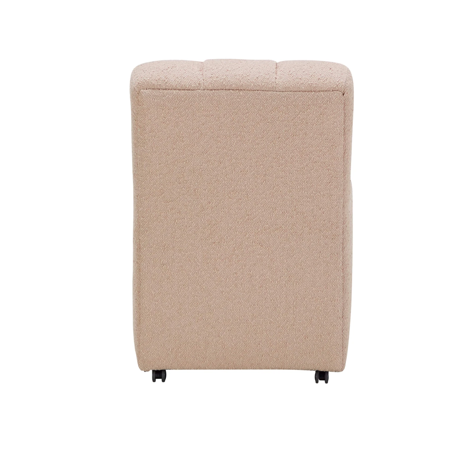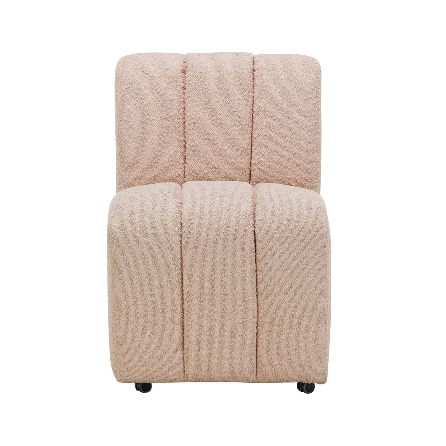 Introducing the Comfort dining chair, designed in a beautiful sleek design with a padded seat and backrest in a mink soft boucle fabric. The base is crafted with 4 wheels to easily move around your dining room as required.