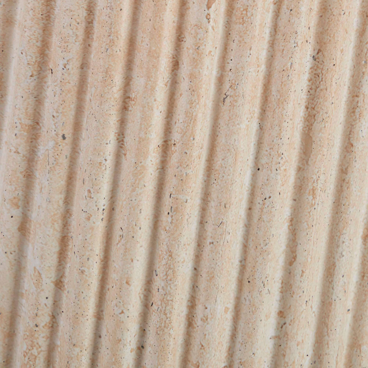 A wonderful 120cm concrete dining table with a bold centrepiece that has a wrap-around reeded design. The reeded effect that wraps around the middle has a stunning travertine effect finish that adds visual intrigue to the piece. With a soft, rounded table top it provides the table with a polished finish. The faux travertine coating provides the table with a distinct style and also helps create a protective coating.