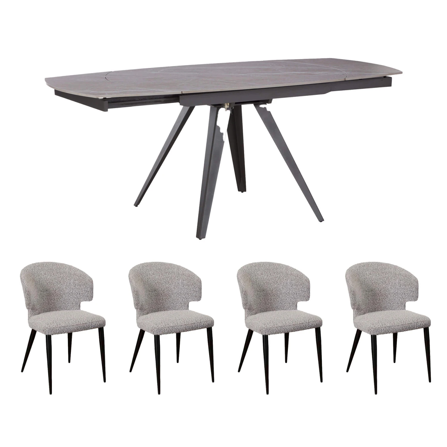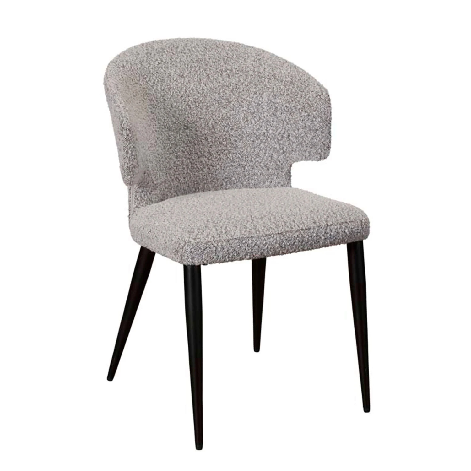 The dining table is paired with 4 Perla boucle dining chairs that have simple elegant look. Each dining chair is upholstered in a hard wearing boucle fabric for a comfortable dining experience. The high back rest that curves under the arms add support. Crafted with black coated legs to add a bold statement to your dining space.