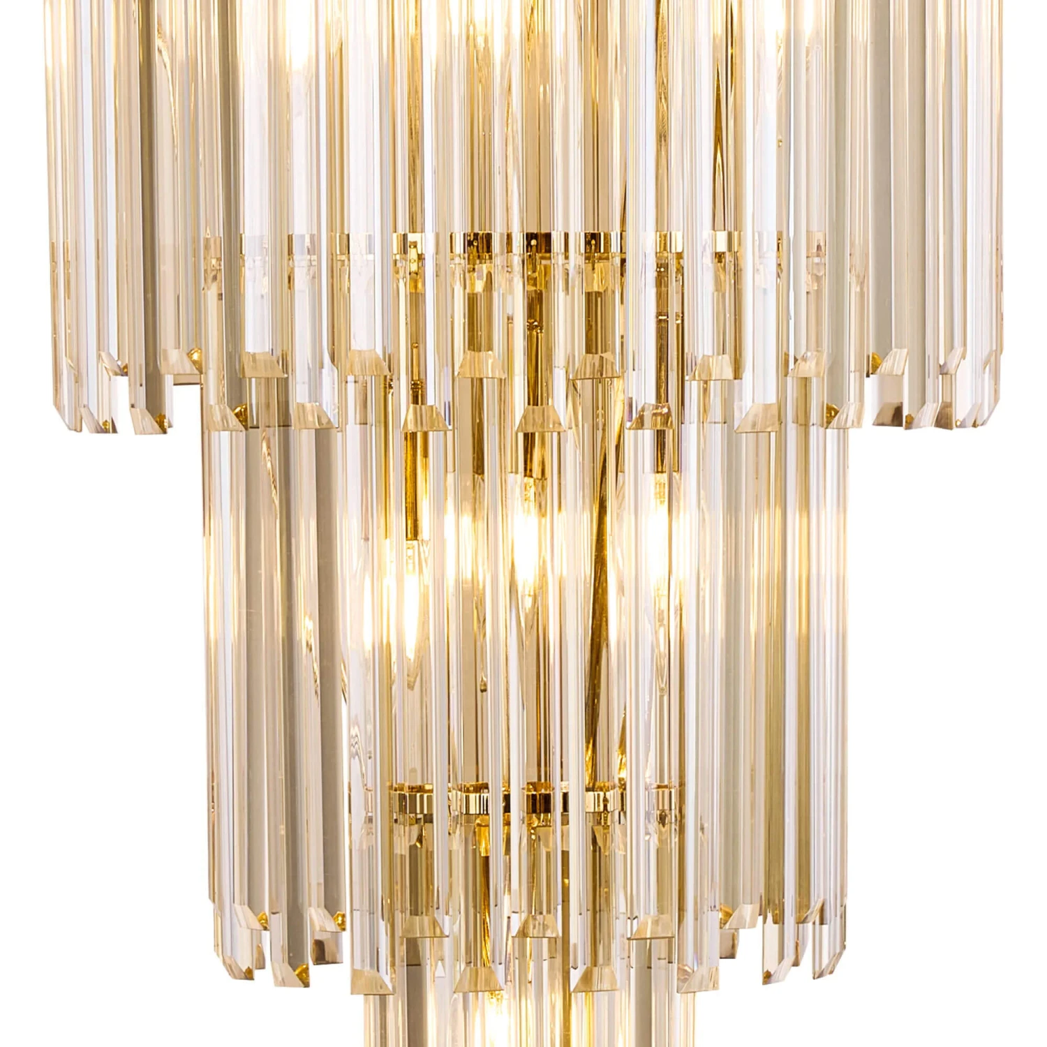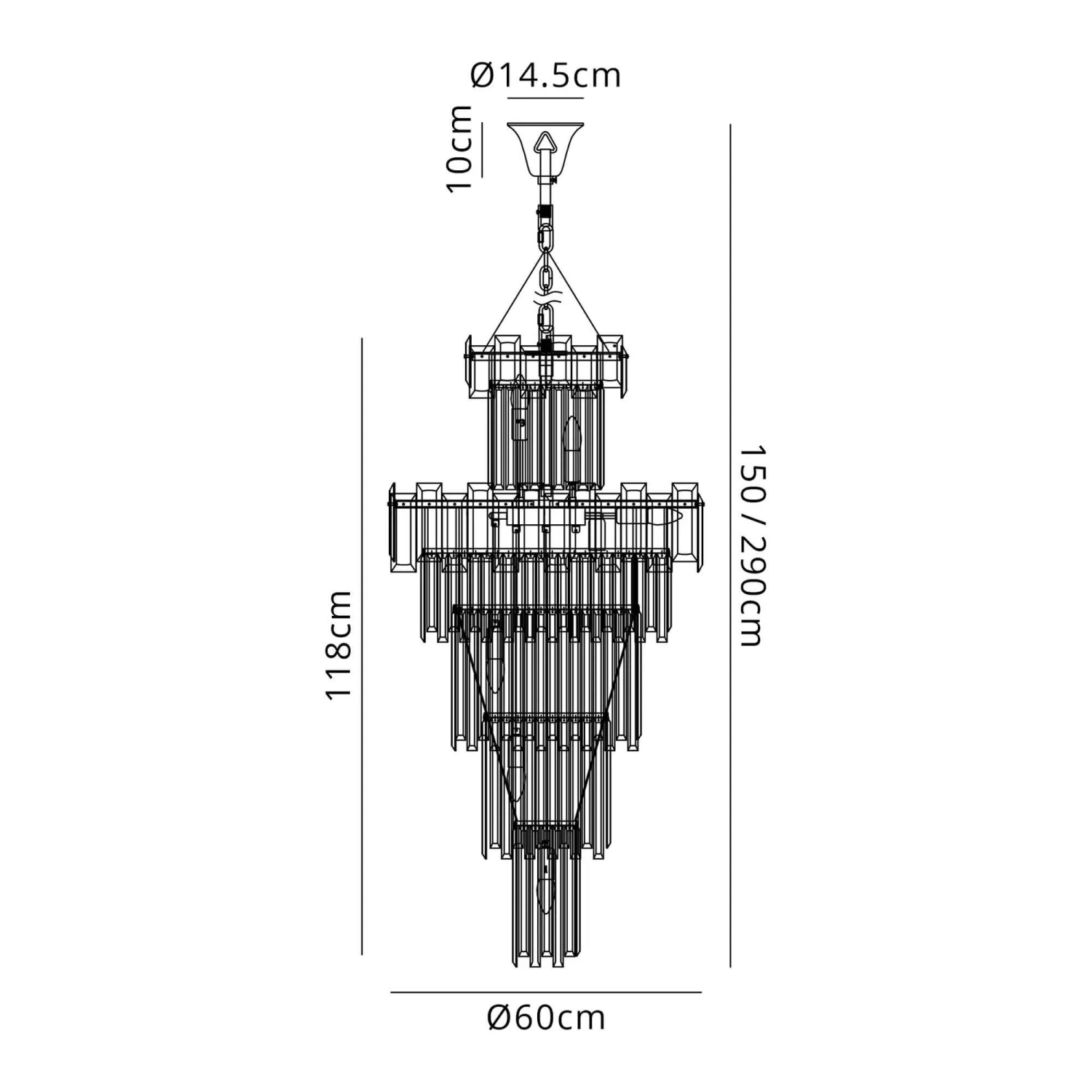 Make a dramatic and luxurious statement in any living space with this Annas French Gold & Champagne Crystal Glass 17 Light Tall Pendant. Illuminable by seventeen required E14 LED bulbs, this exquisite tall pendant light features a round French gold iron base with a tiered cascade of elongated champagne K9 crystal glass rods that have been cut into different sized rectangular forms, increasing the character and decadence of the piece whilst able to radiate a warm and dazzling ambient glow. Adjustable in height from 147cm to 291cm, this stunning pendant light combines modern opulence with timeless sophistication and will effortlessly create a statement in any room, making it ideal placed in a hallway, stairwell or high-ceiling room of any classic or contemporary interior.