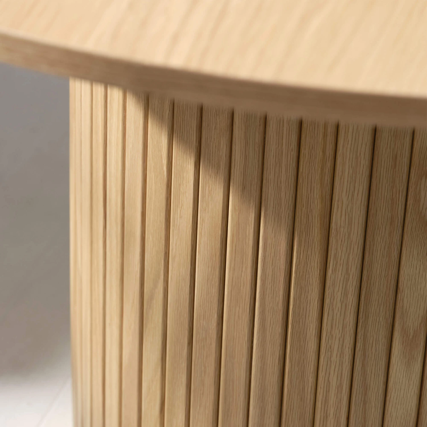Made from a natural oak veneer in a cool brown tone, with a textural appearance echoing the grain and raw beauty of natural wood, the Annika has a certain charm. Signature slatted panelling on the solid, column-like structure of the central cylindrical pedestal on this piece further elevates its rustic appeal, whilst lending this table its unmistakable character and attractive, architectural-like quality.