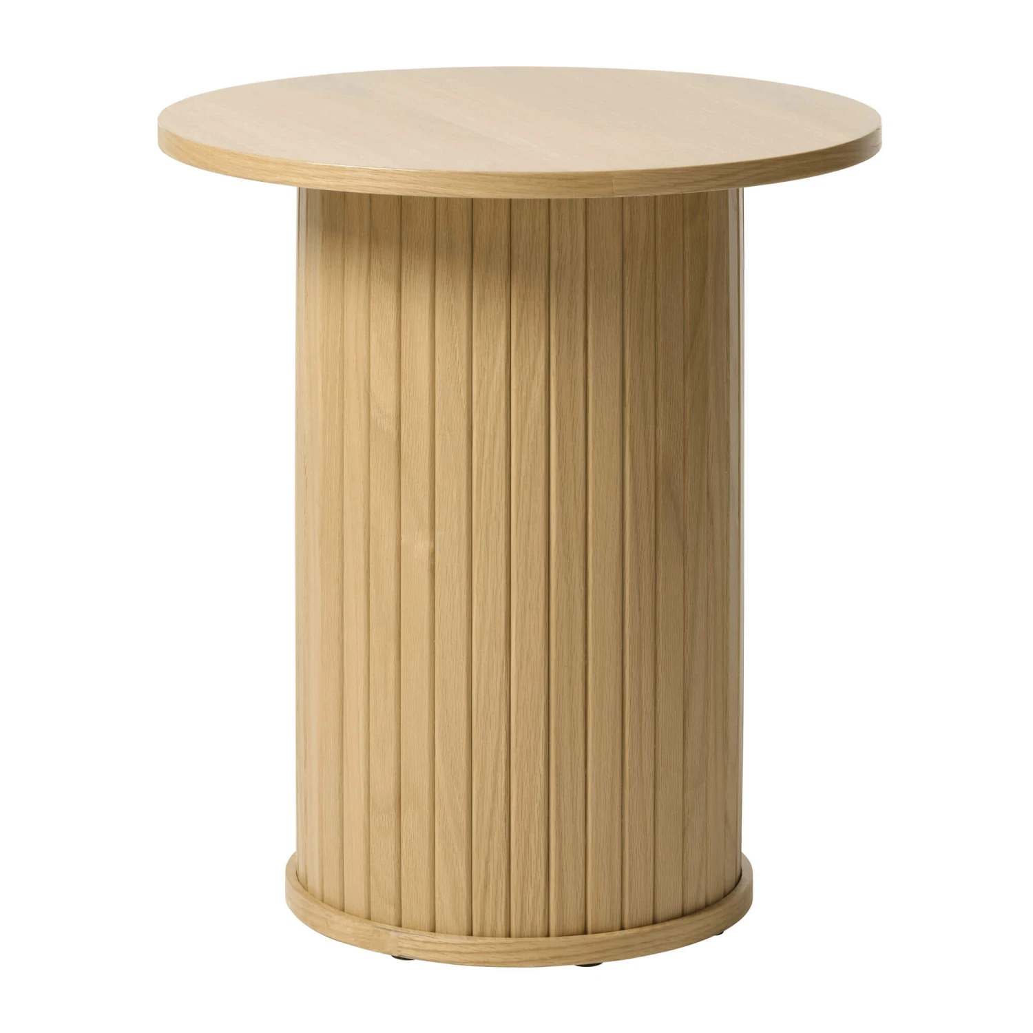 An elegant light oak veneer side table with a circular top boasting sleek features for a minimalist stylish look, crafted with a vertical panelling detail base for a subtle twist on a scandi style. Ideal for displaying beautiful floral arrangements or your favourite lamp.