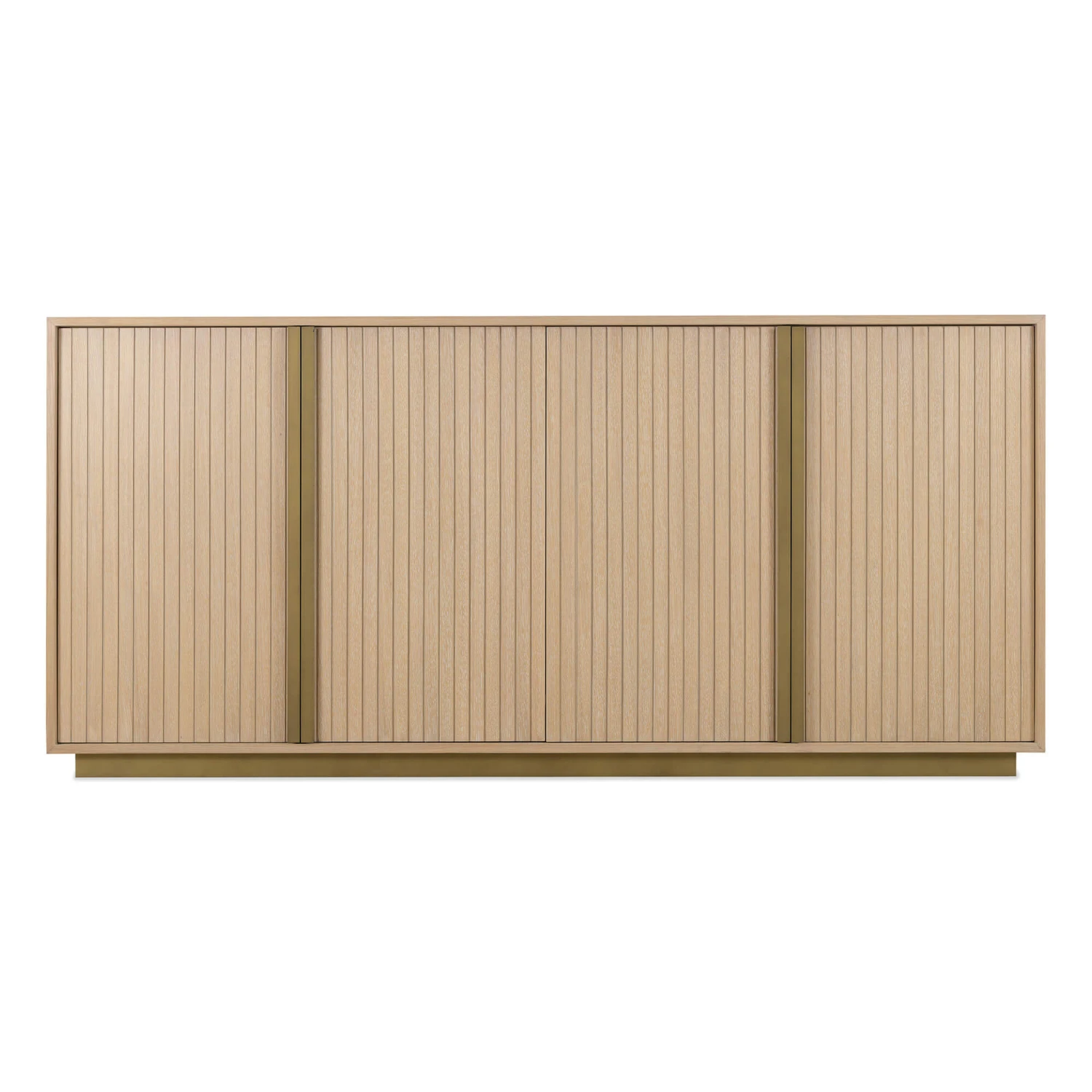 Crowning the reeded doors are striking, full-height bronze coloured handles that run from top to bottom of each door, offering a subtle contrast to the light oak. The sideboard is elevated by a sleek bronze coloured base, which lifts the unit and completes the modern aesthetic.