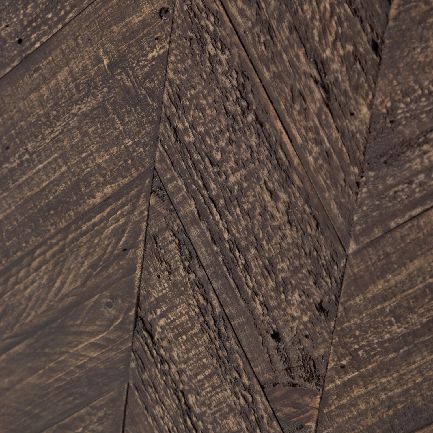 A large dark wood 3 door sideboard featuring a three large, generously sized compartments, each with an integrated shelf. On the top is a striking slatted panel pattern that runs length ways. The dark brown wood is seen throughout and highlights the woods natural grain, character and distinct charm.