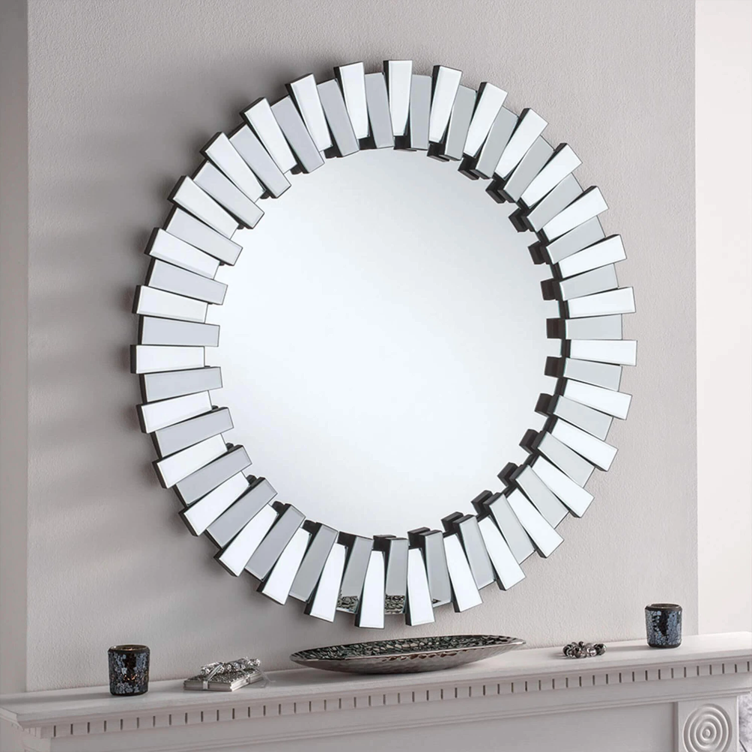 This Astra Round Mirror adds a contemporary look to your room. The mirror features a frame that is made up of individual angled mirror pieces with a large, round mirror in the middle. This mirror is perfect for hanging above a cabinet, sofa or fireplace to complete the look.