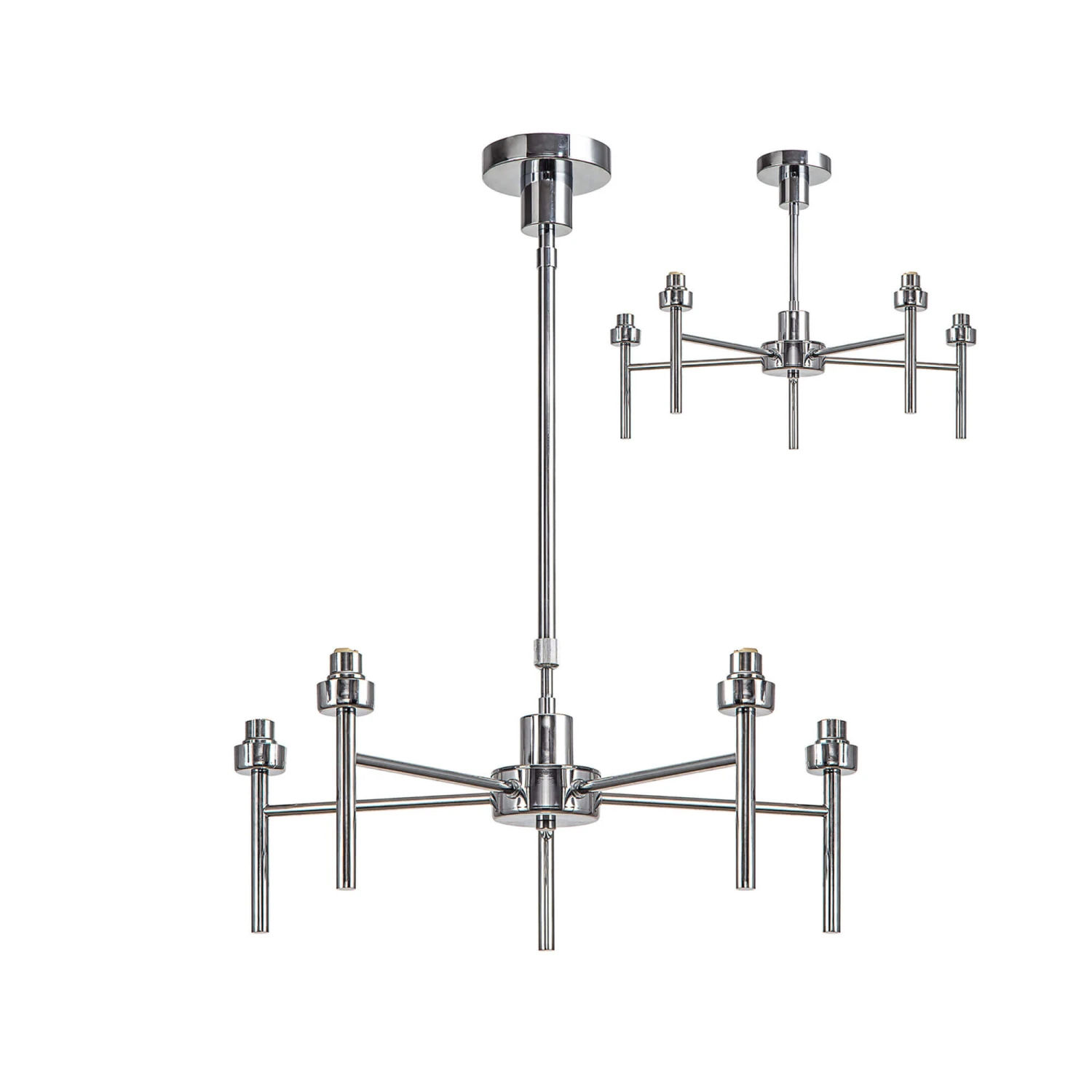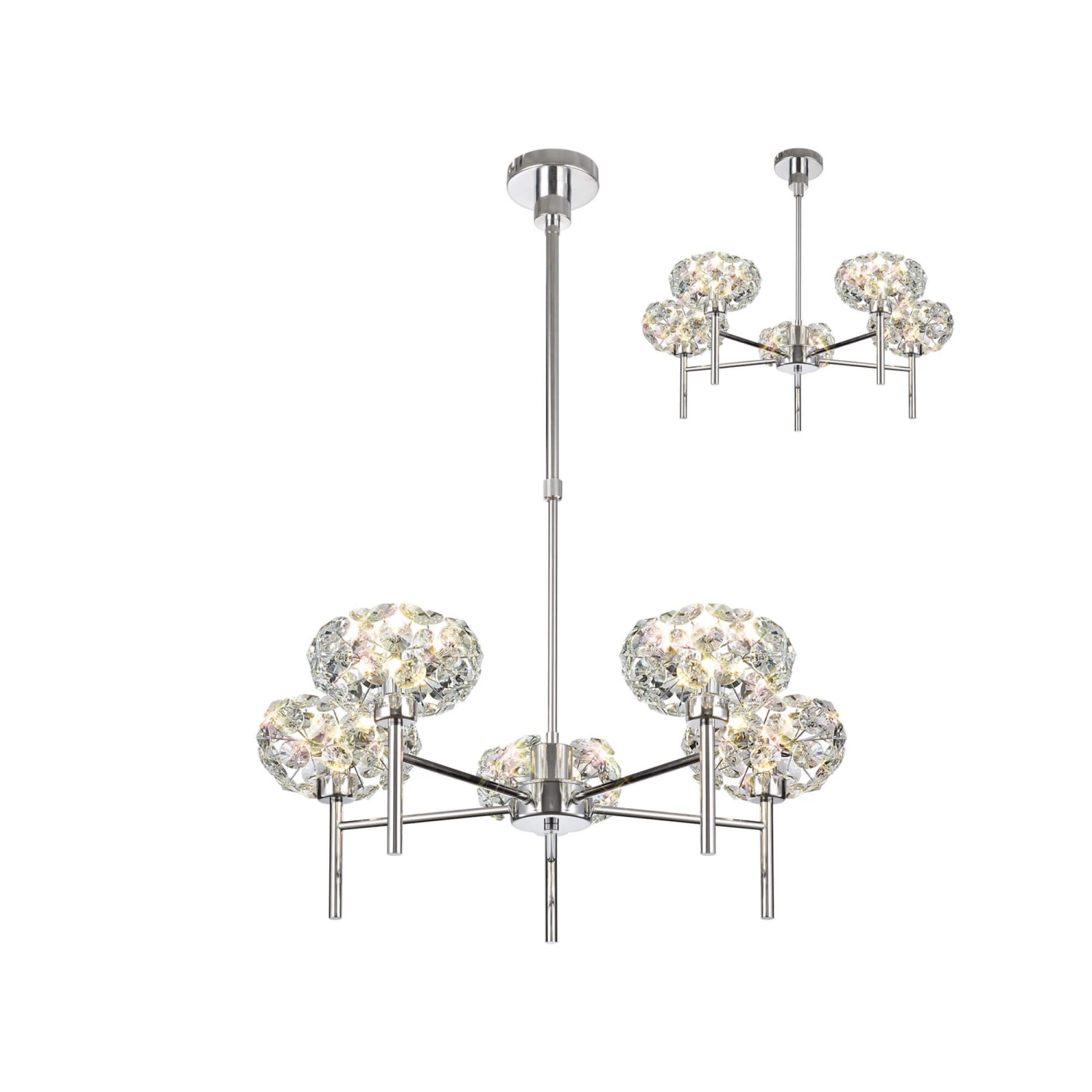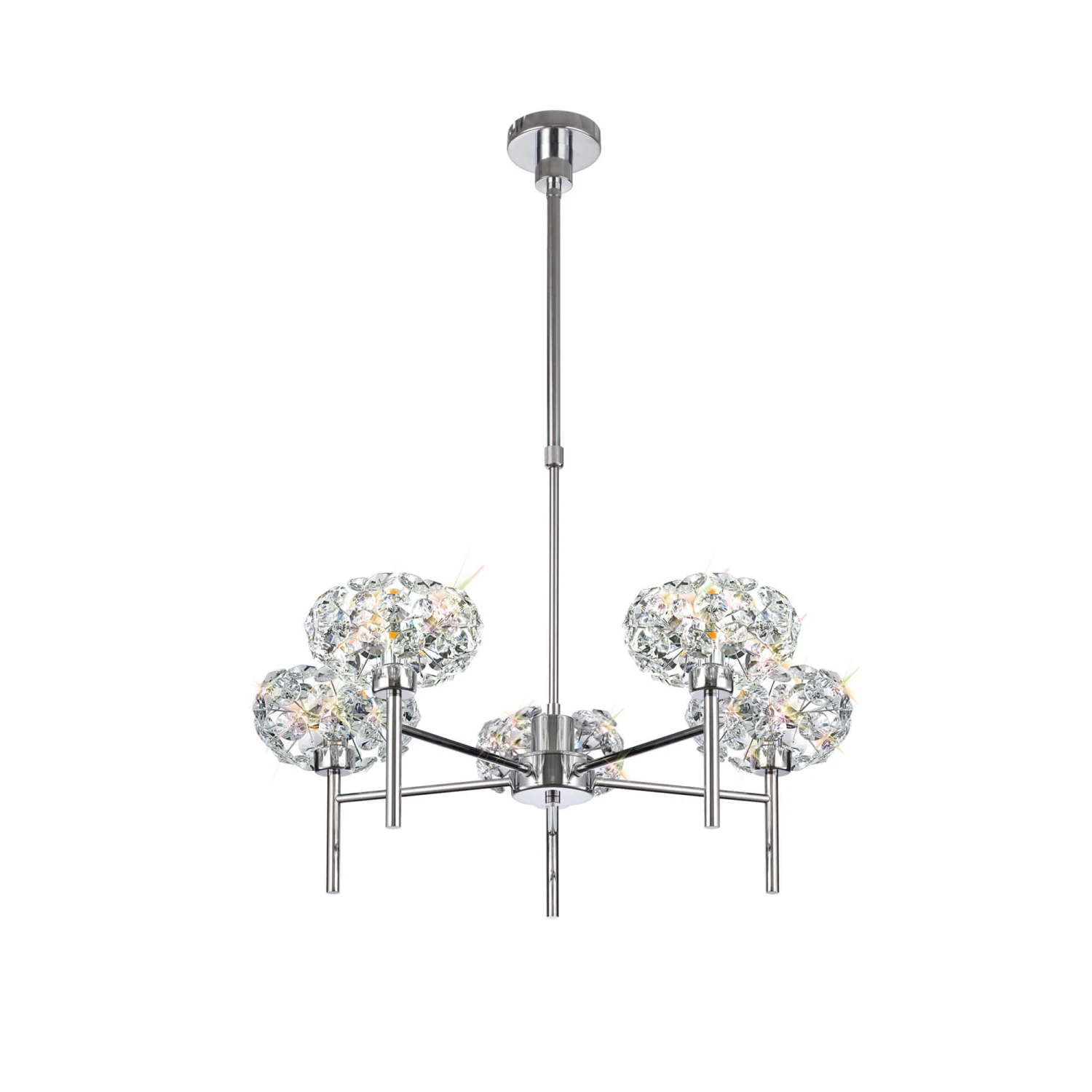 This adjustable, telescopic Avezza Chrome Crystal 5 Light Pendant Light has five polished chrome finish arms which hold the K9 crystal lamp shades. Light refracts through the crystals in stunning spectrums, and, with the required lamps and dimmer, are dimmable to provide a personalised light display. At 67cm diameter, this is a perfect light for making a glamorous statement over a dining table, an entryway or living space.