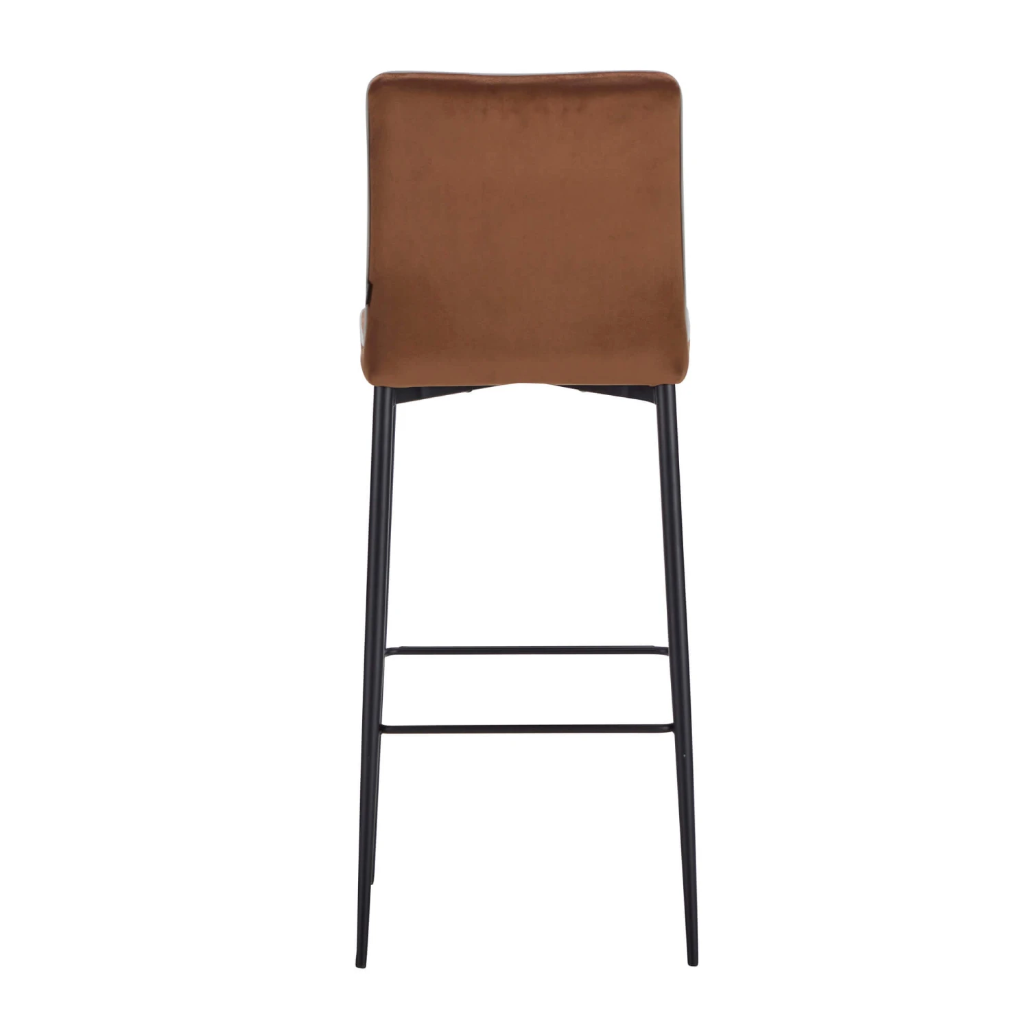 The Nata Bar Stool features slimline black legs with a bar across to create a comfortable footrest. Upholstered in a deep brown fabric with a complimenting white piping edge, it makes for a luxurious retro finish.