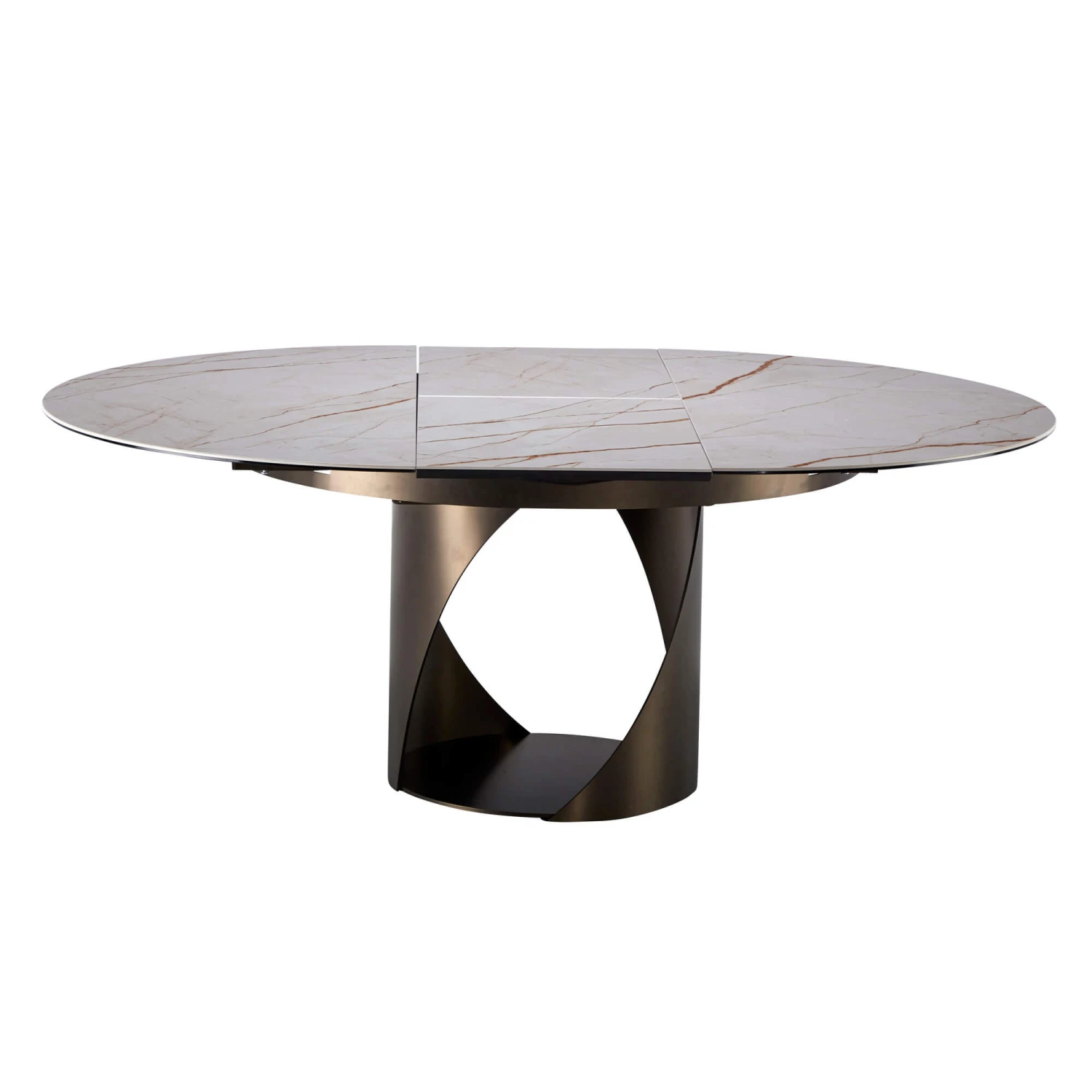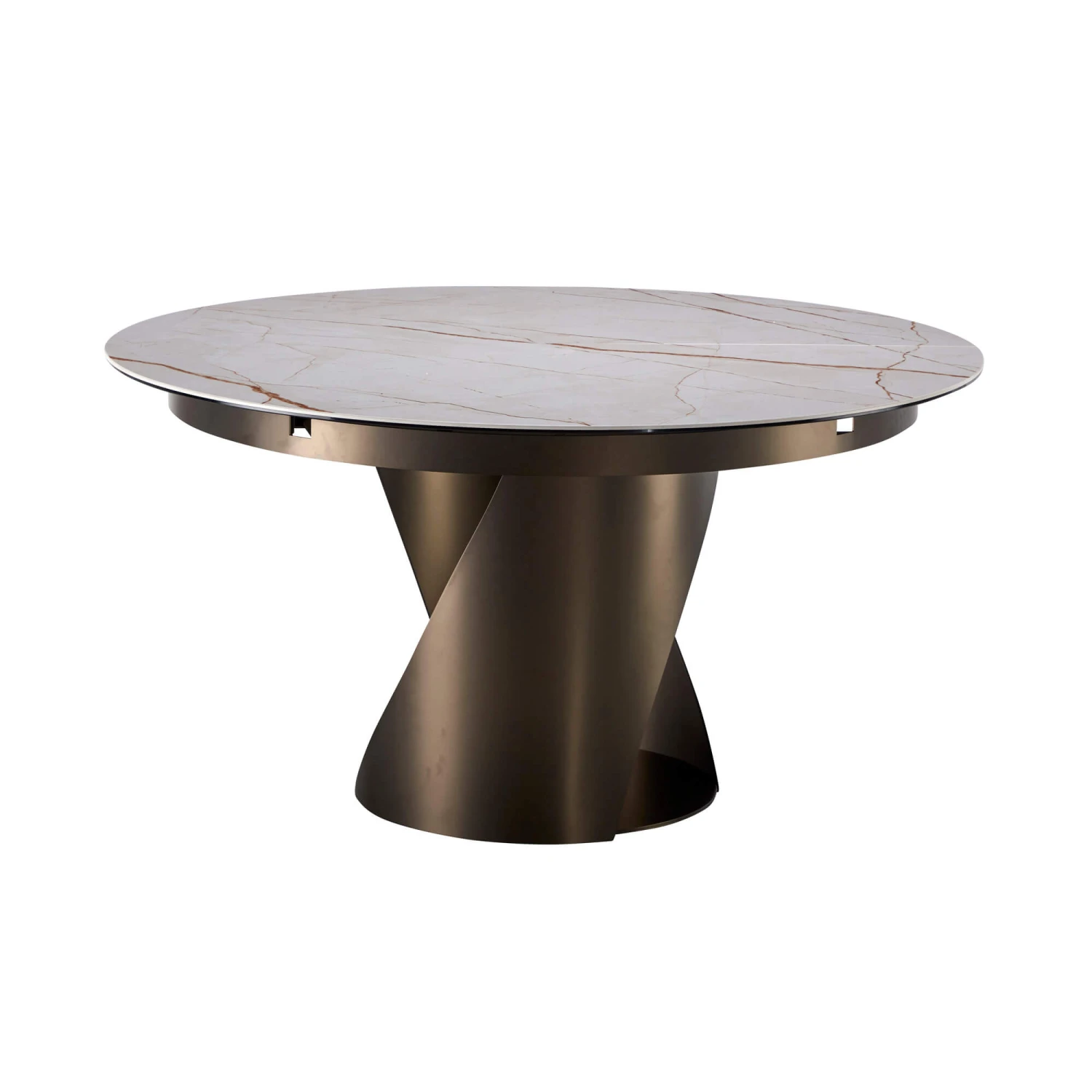 Characterized by its cyclonic shaped base, this extending marble table has unique character and charm, ideal for contemporary living spaces. The base consists of two, warped sheets of metal, finished in a wonderful matte bronze whilst the table has a soft glossy ceramic top. The table has a compact extending mechanism allowing the table to extend out to 190cm, changing it from round to oval.