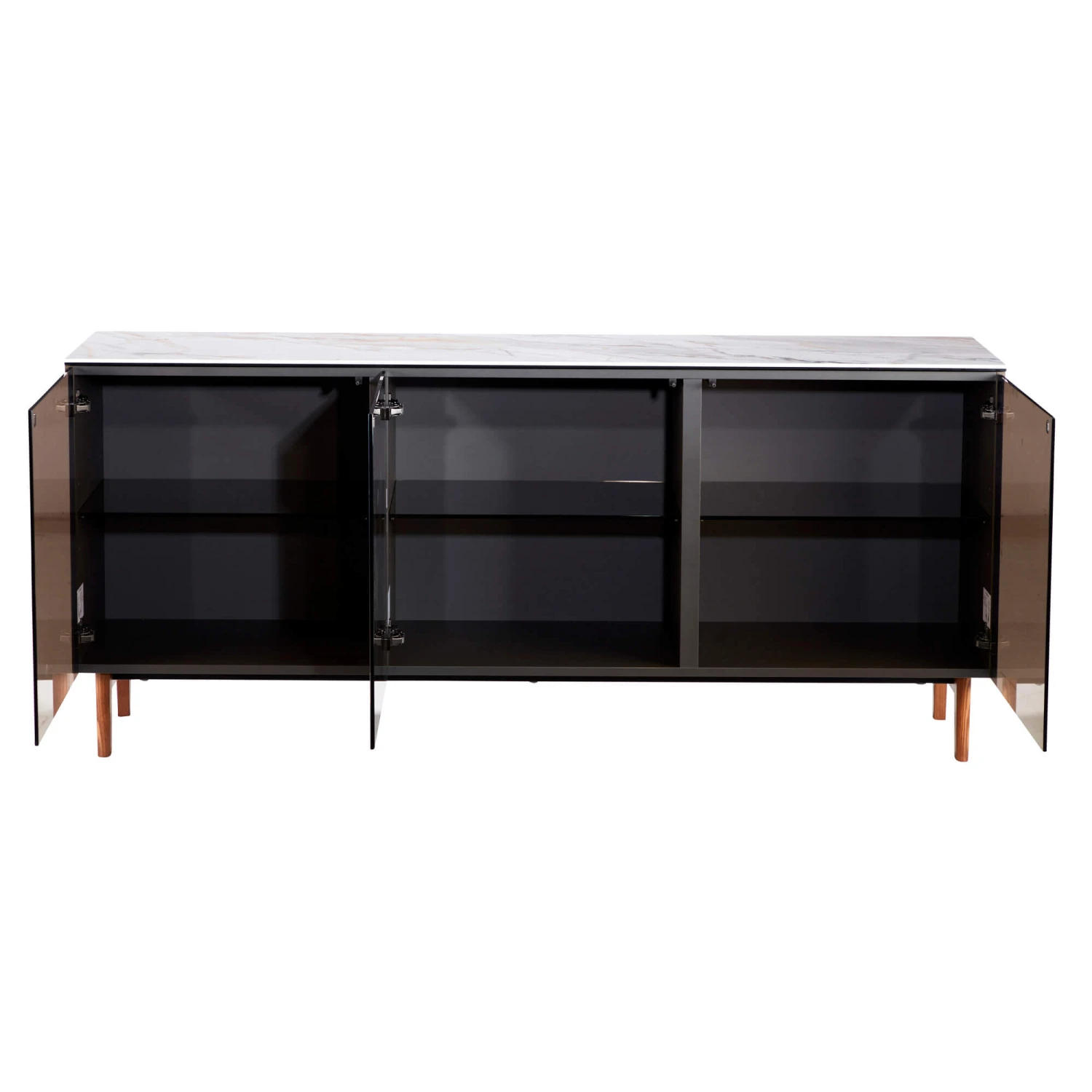 A bold, sophisticated sideboard that features a stunning marble effect top made from a durable bonded ceramic which is easy to clean, and has a strong resilience to scratches, impacts and chemicals. The three tempered glass doors are easy to open to close with just a simple push and are designed to showcase your stunning products stored inside. With strong solid wood legs, it ensures strength and longevity allowing you to elevate your living or dining room for years to come.