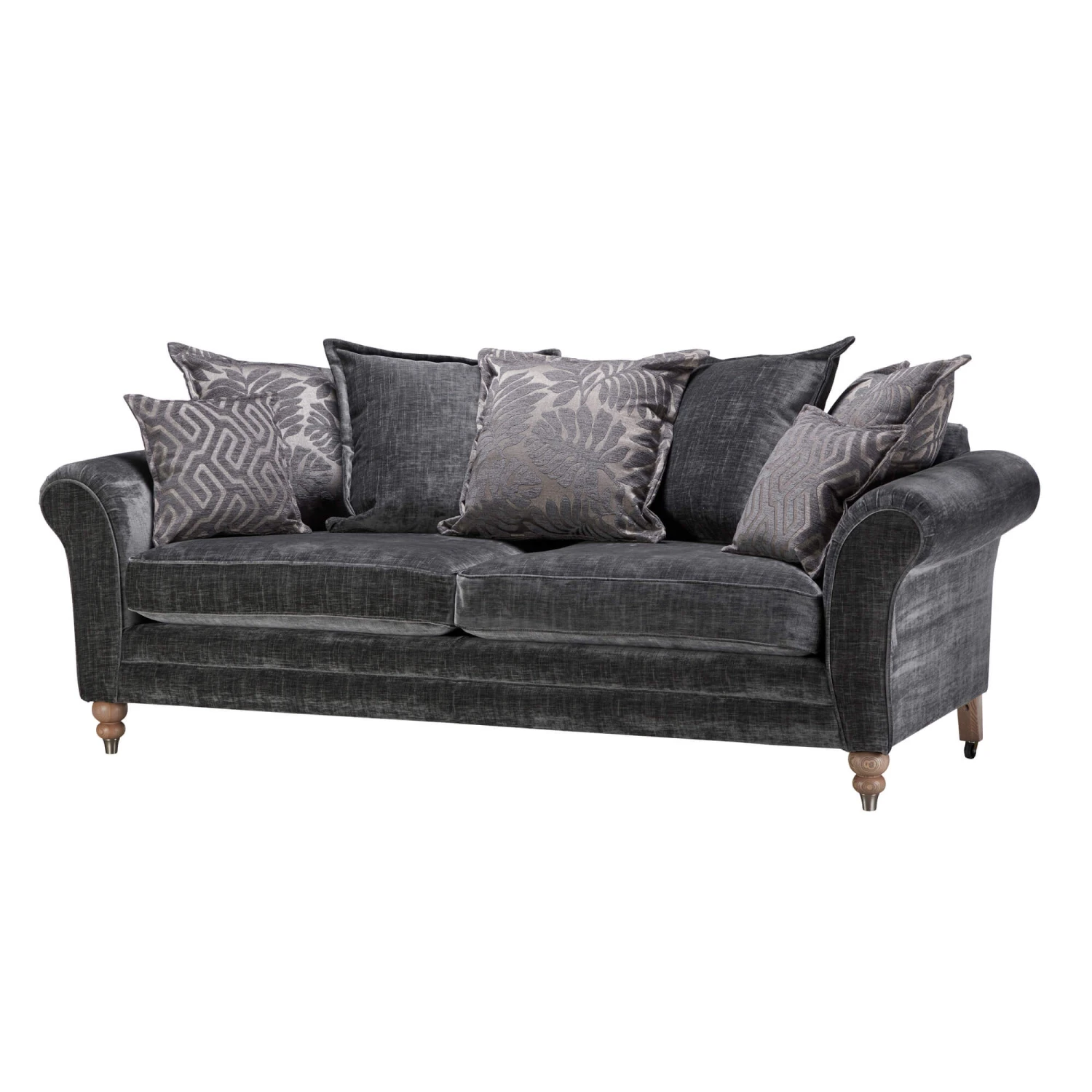 Packed with timeless character and traditional charm, the Carolina sofa inherits the hallmarks of high quality detailing that we associate with the best of British manufacturing. Each piece is hand crafted with meticulous detailing, with a gorgeous palette of charcoal greys, slate velvety chenille and patterned damask accents to create a fusion of texture and interest.