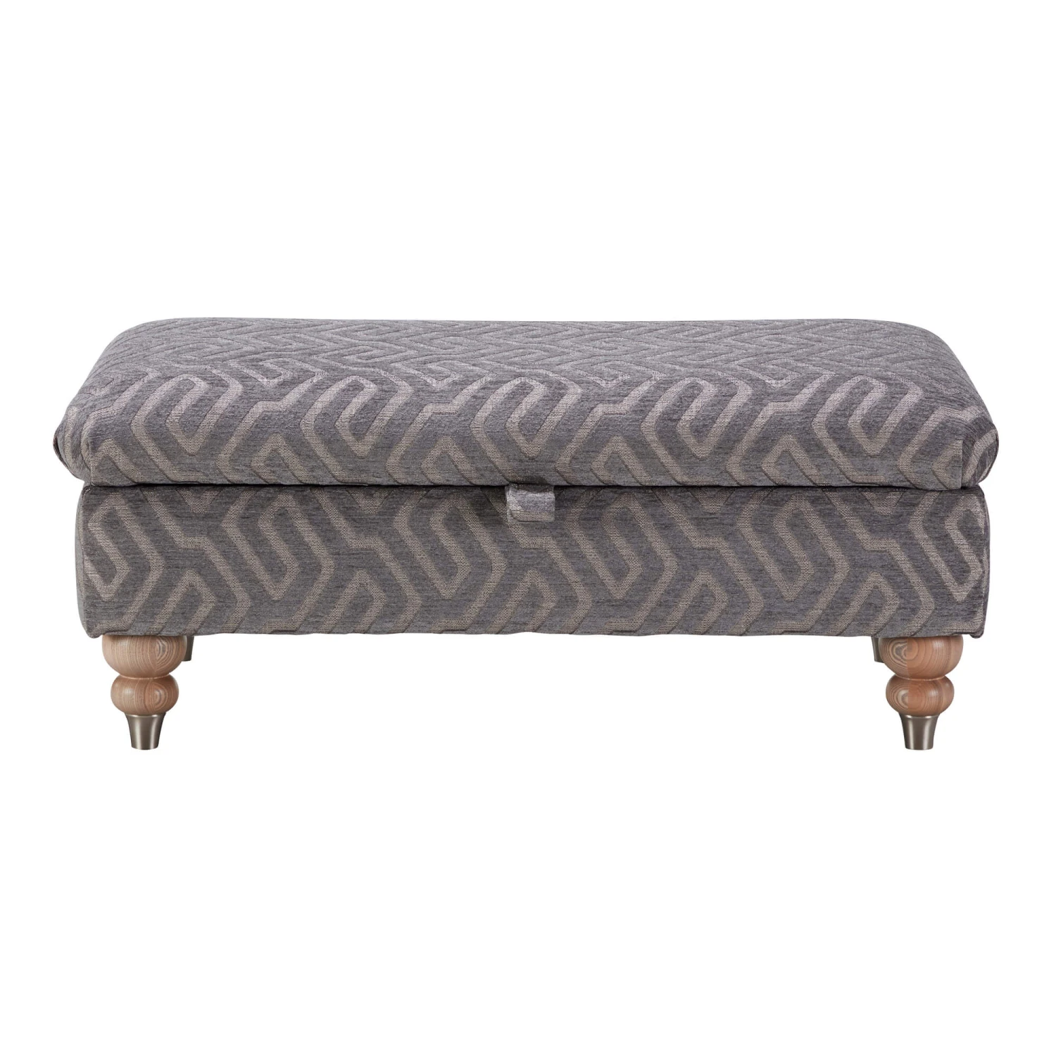 The Carolina Grey Geometric Patterned Fabric Legged Ottoman inherits the hallmarks of high quality detailing, associated with the best of British manufacturing. With a lift-up ottoman design, the Carolina ottoman is the perfect accent piece which offers additional storage space whilst providing a comfortable place to rest your legs at the end of the day. The Carolina Legged Ottoman is upholstered in an eye-catching geometric patterned fabric, enhanced by elegant, light wooden turned legs for a classic look.