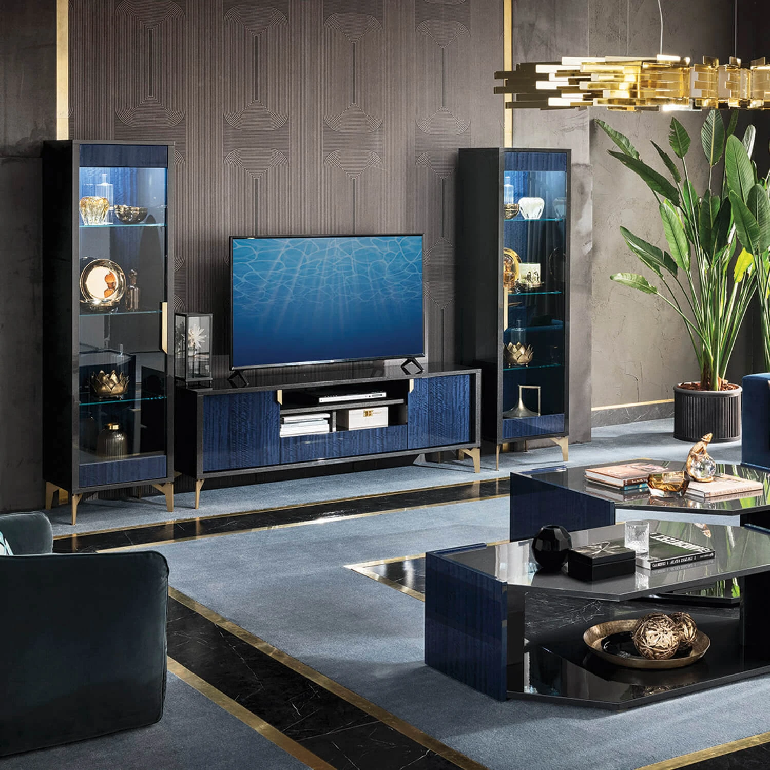 Designed to be noticed, the Celeste High Gloss Cobalt Blue TV Unit has a certain presence and is sure to make an impression in any home, with its exquisite, statement features and stand out design that cannot be ignored. Expertly crafted in Italy, from the finest materials with an impeccable attention to detail, the Celeste is an artisan piece to be admired. Bold cobalt blue tones combined with brushed brass accents define this TV unit and form a visually striking yet elegantly refined design, which is sure to stand proud in any setting.