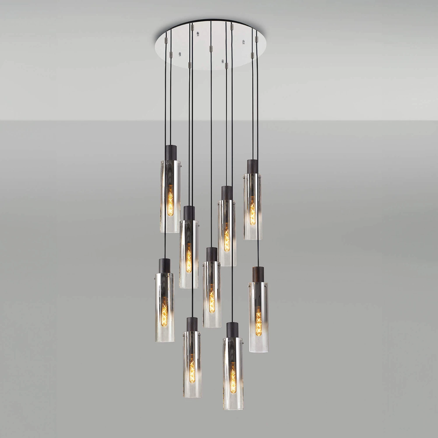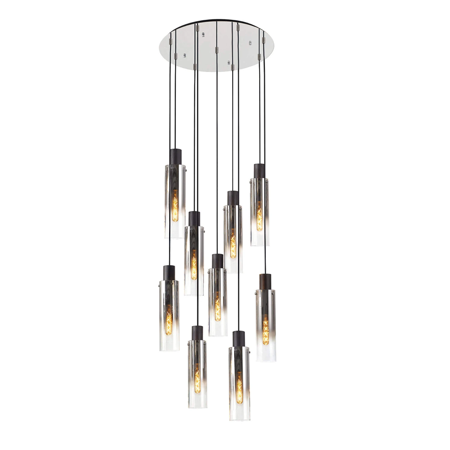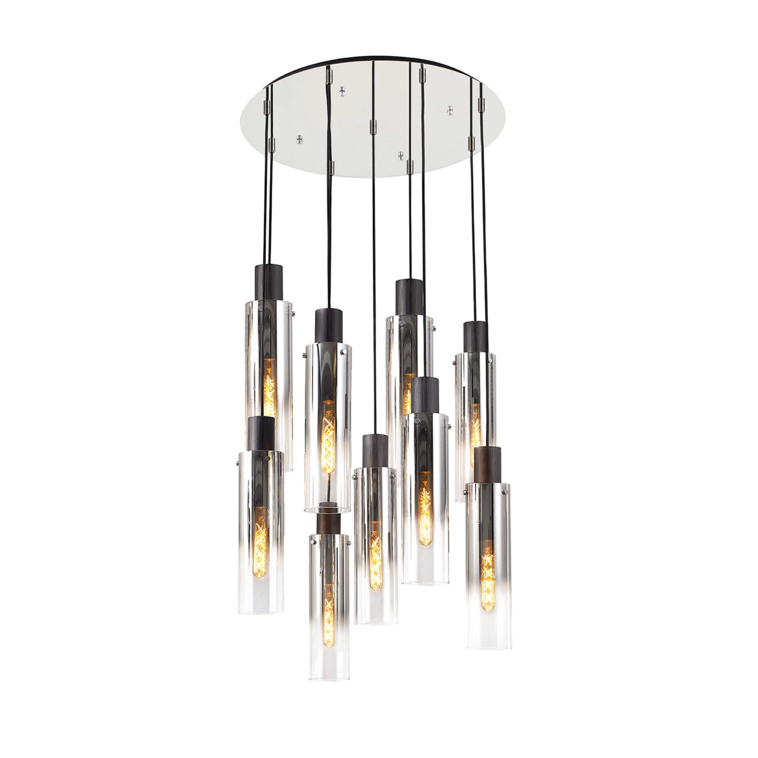 Add a minimal and modern touch to your home with this Chelsea Slim Satin Black & Smoked 9 Light Pendant. Illuminable by nine E27 LED bulbs, this beautiful pendant light features a black finish with a smoked ombre effect on nine slim glass cylinder shades, attached to a chrome metal round base, offering versatility with its unique and stylish design. Adjustable in height from 46cm to 296cm, this elegant pendant light is perfect for complementing any modern interior.