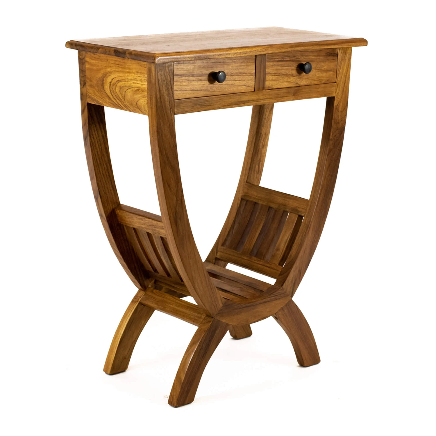 A durable hand-crafted console table that is crafted from a strong teakwood. Featuring two drawers it provides you with ample space to store accessories such as jewellery and remotes. On the base is a small shelf with two supportive edges, making it ideal for stacking and storing books or even a pair of shoes. With 4 curved legs, it adds character to the unit.