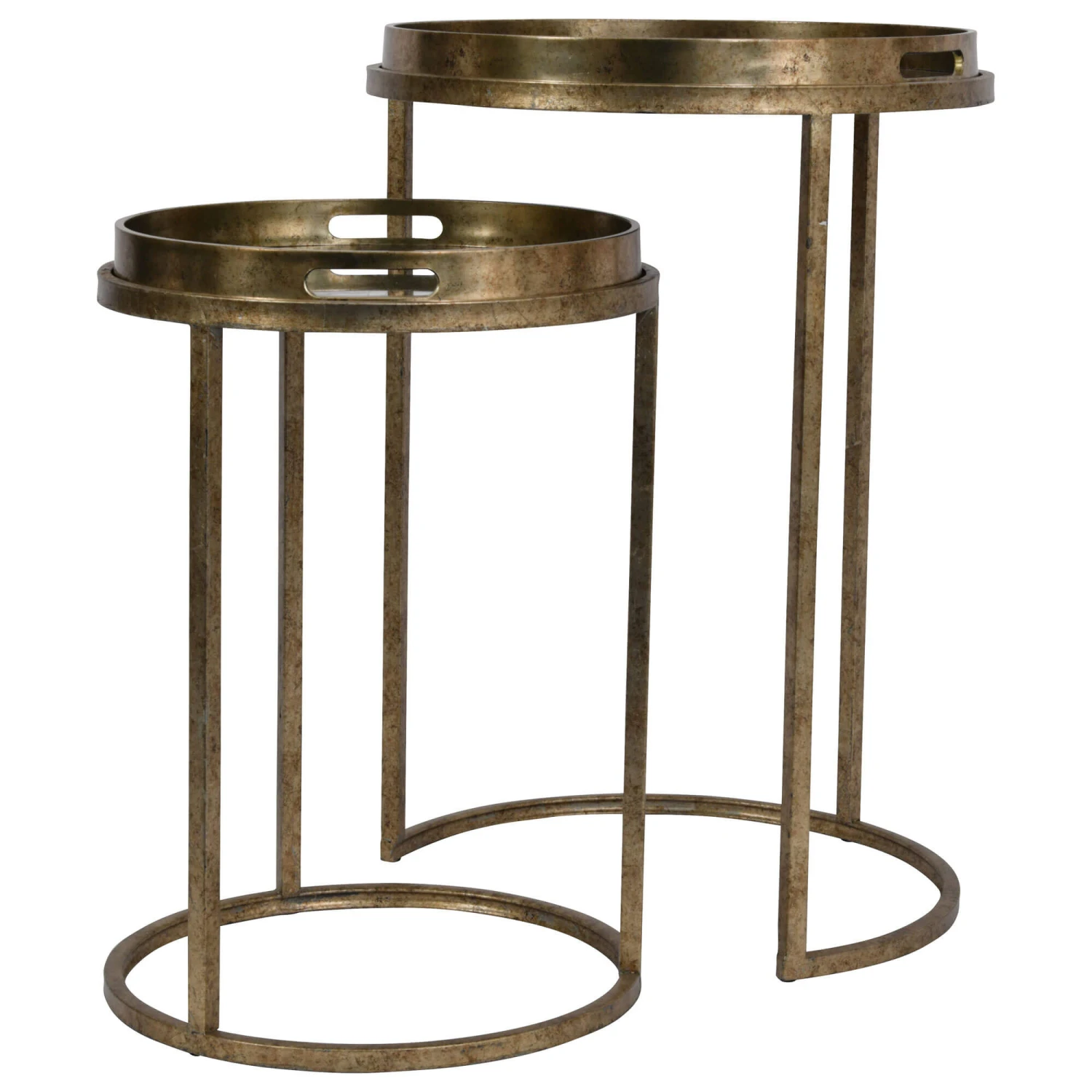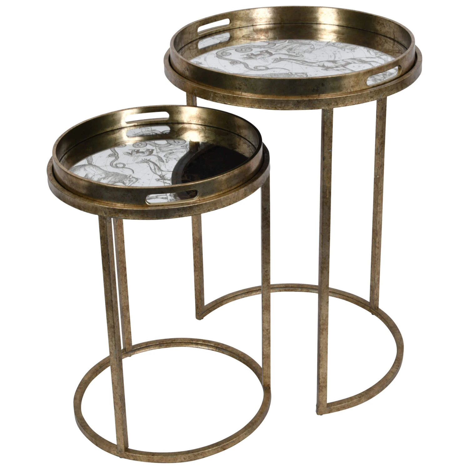This set of two side tables features a elegant constellation and zodiac signs, with a brushed gold finish for an antique style. The top of the tables also lift off creating a tray feature, making them ideal for entertaining while being part of your décor. The larger table has an open section allowing the smaller table to nest underneath and safe space when not in use.
