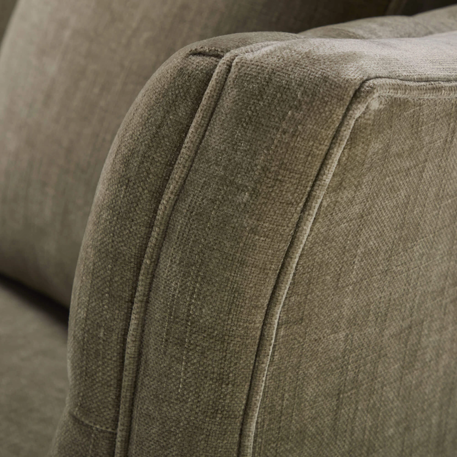 The Valencia Mythica Sage Fabric Medium Sofa by David Gundry is a timeless expression of elegance and comfort. Upholstered in a plain Mythica sage fabric, the Valencia showcases a refined silhouette with graceful lines, sumptuous cushions, gently splayed valueed arms, a gracefully scalloped back, a self piping and wenge wooden legs with a chrome metal finish, creating a rich and sophisticated statement piece.