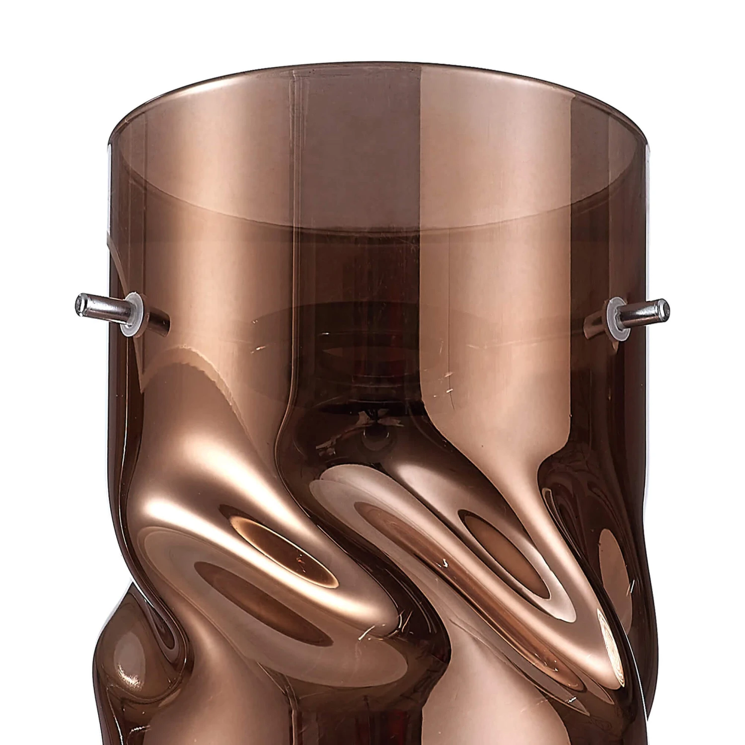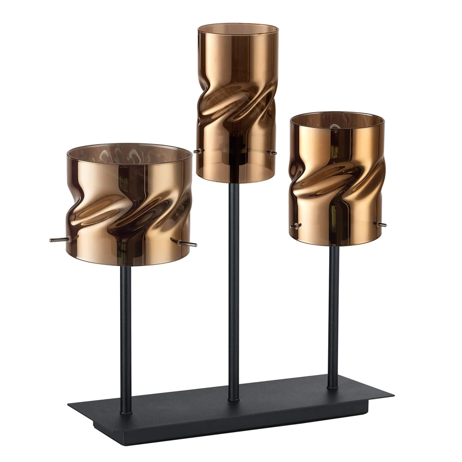 A staggered height 3 light touch lamp featuring 3 individual twisted copper shades with complimenting black stems. There are varieties of shades, each with different widths and heights, adding character and breaking up the lights original simplistic style. With each of the shades having individual twist, it creates a compelling aesthetic appeal.