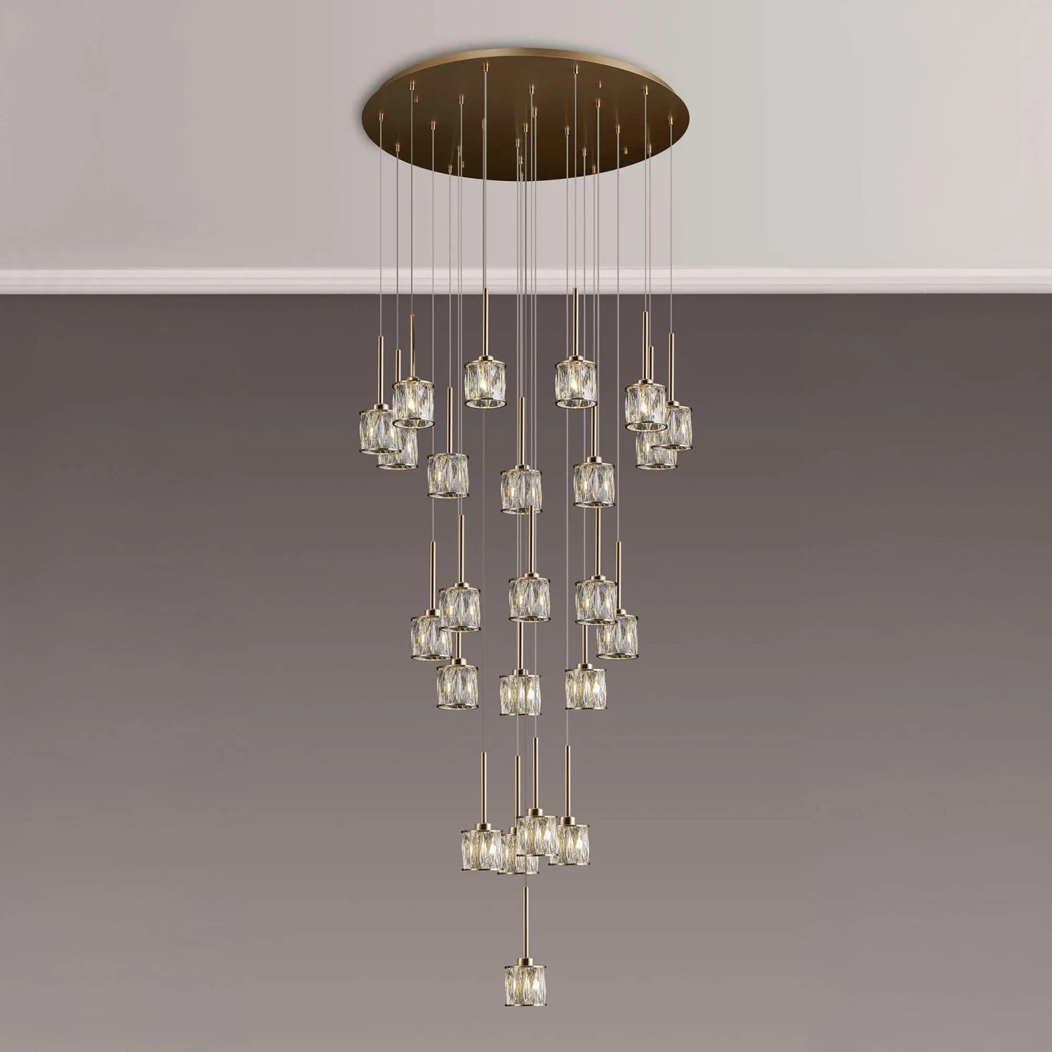 The Delia French Gold & Crystal 24 Light Pendant is exquisite and luxurious in design. Illuminable by twenty four G9 LED bulbs, this elegant pendant light features twenty four clear cylinder crystal shades with a round French gold base, providing a bright but cosy atmosphere. Height adjustable from 34.5cm to 509.5cm, this extravagant pendant light is perfect making a statement in any room while adding a touch of glamour to any contemporary interior.