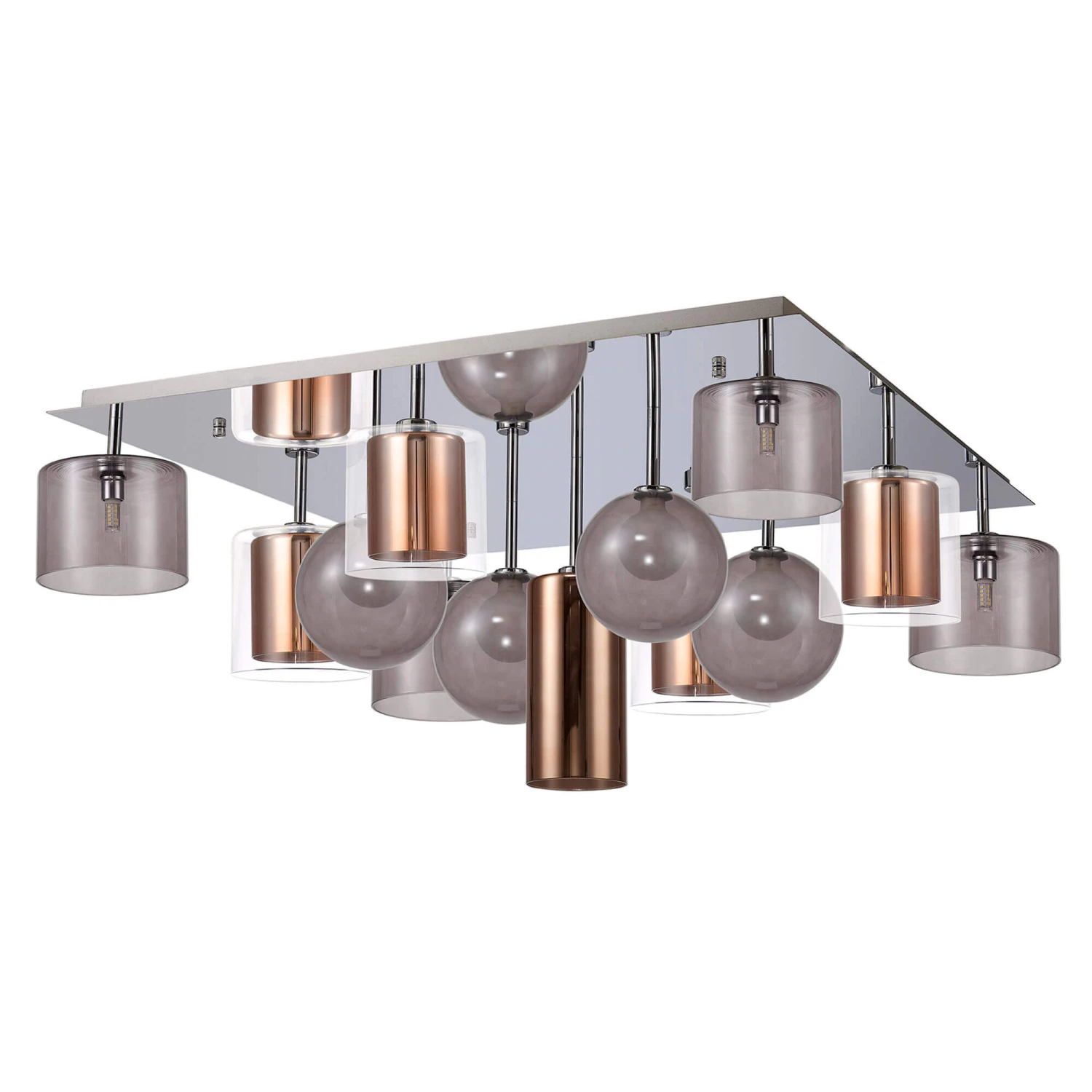 Add a statement bespoke design to your home with the Delia Polished Chrome & Mixed Glass 13 Light Flush Ceiling Light. Illuminable with an impressive thirteen G9 LED bulbs, this stunning light fitting features multiple striking copper and smoked glass shades on a polished chrome base. The various suspension drops of the round and cylinder shades create the most magnificent centrepiece for your chosen living area, and the dimmable feature enables your desired ambience to add a beautiful warm glow so you can relax and unwind.