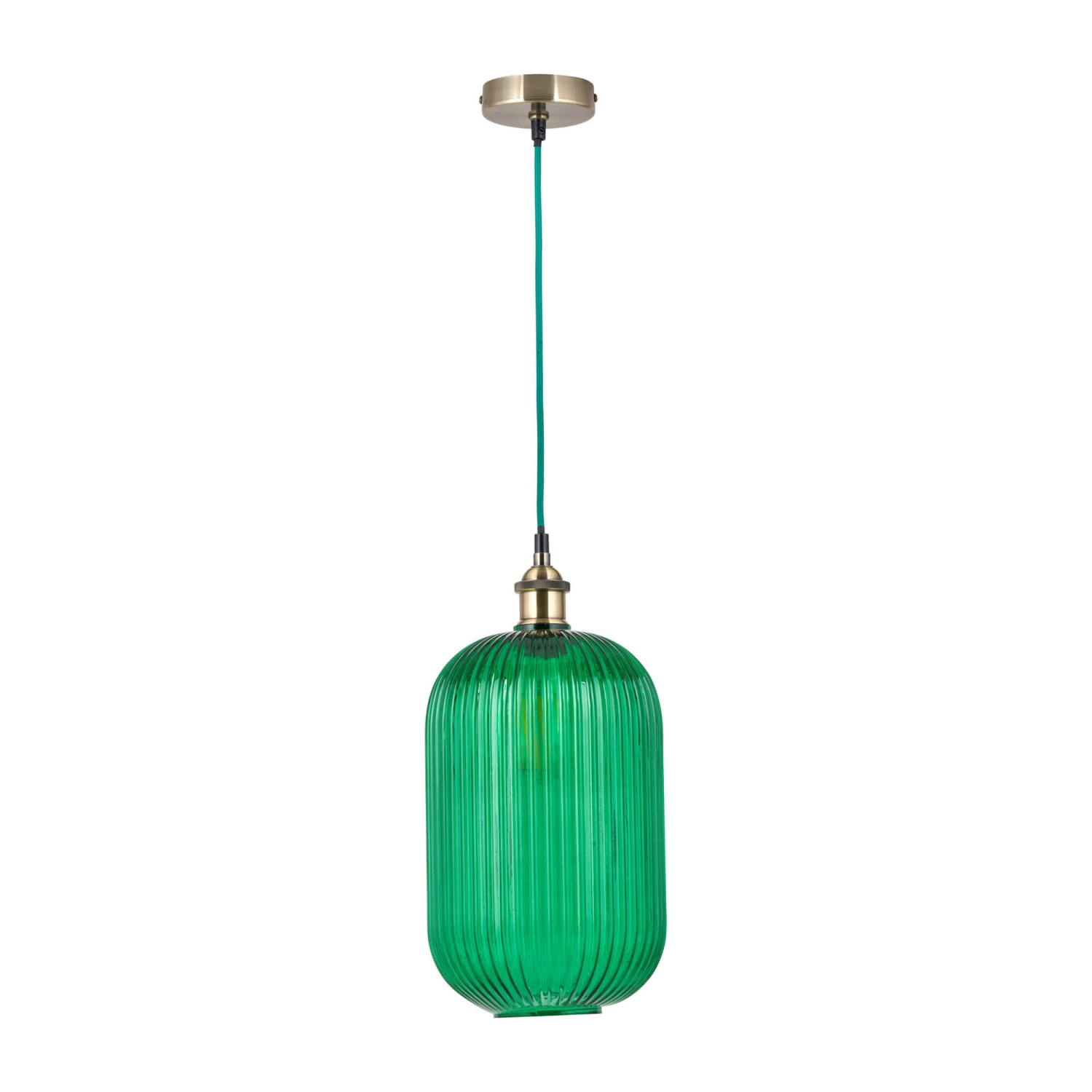 Introduce a luminous and sophisticated touch to your living space with this Varese Emerald Green Ribbed Glass Pendant Light from Designer Guild. Illuminable by a required bulb, this exquisite pendant light features a curved cylinder ribbed glass shade in a deep emerald green finish and a green fabric flex on a round metal antique brass base, providing a warm and inviting ambient glow. Able to be hung as a single piece or in multiples for a dramatic effect, this beautiful pendant light will make a striking statement in any room with its eye-catching and stylish appearance.