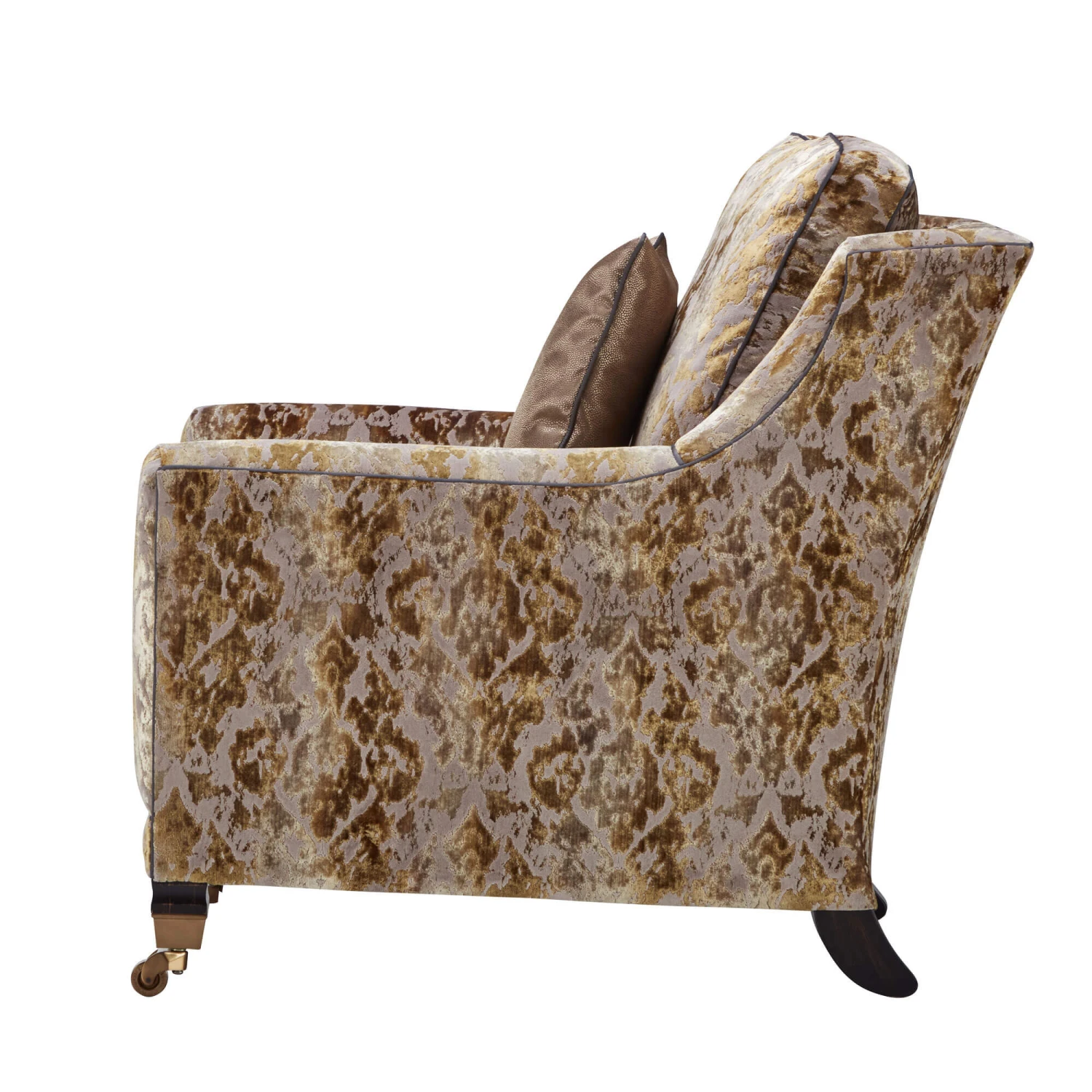 The Horatio Imperial Gold Fabric Armchair from Duresta combines luxurious comfort and opulent sophistication. Upholstered in an Imperial gold patterned fabric, the Horatio armchair features a deep seat, straight arms, contrasting Grosgrain grey piping and umber wood with antique brass metal castor feet, creating a beautifully rich yet traditional piece.