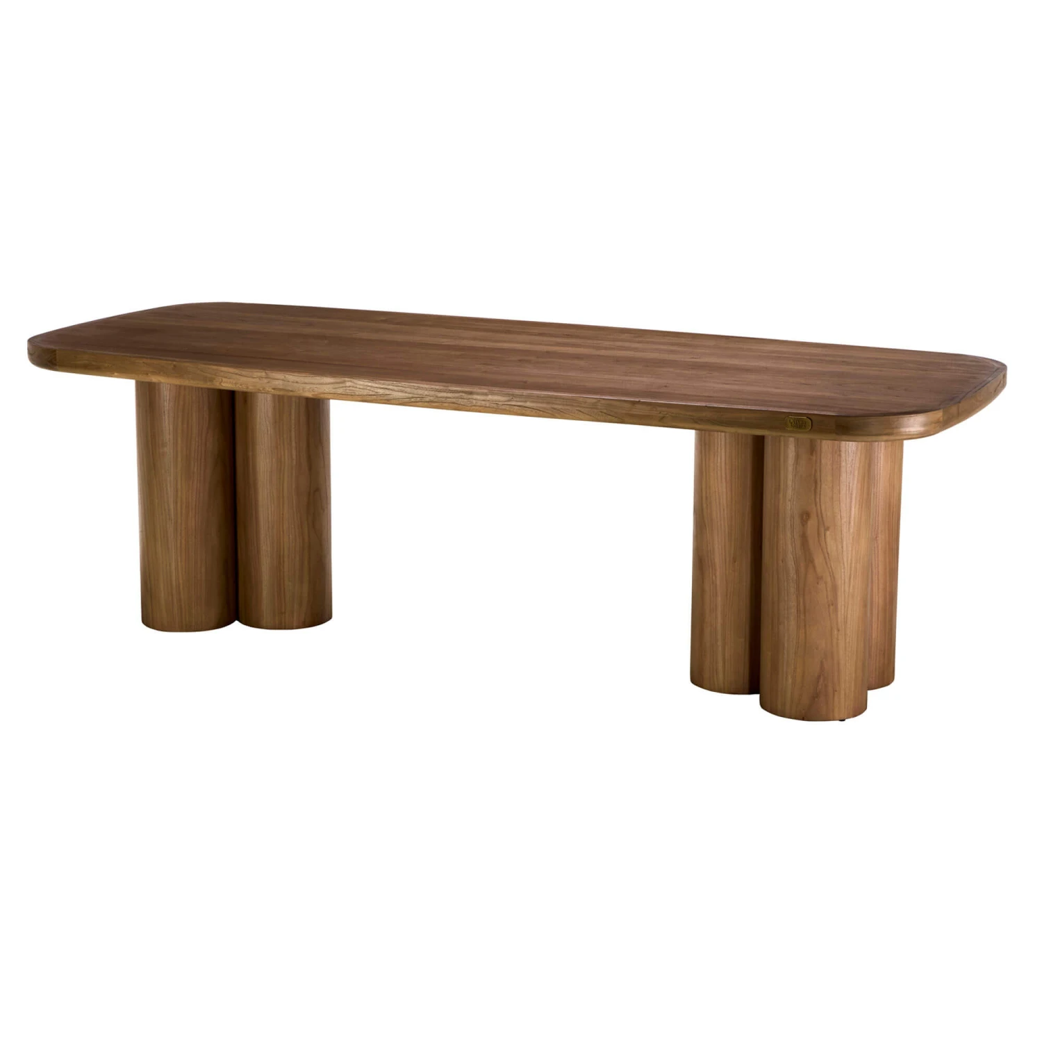 A long 240cm Elm Wood dining table featuring two striking legs that are made up of a cluster of three cylinders adding a distinct character to the table. The table top features a curved edge table top that adds charm and compliments the cylindrical legs adding an organic, smooth shape. The whole table is made from solid elm wood and is embellished with a signature ‘Olivia James’ branding.
