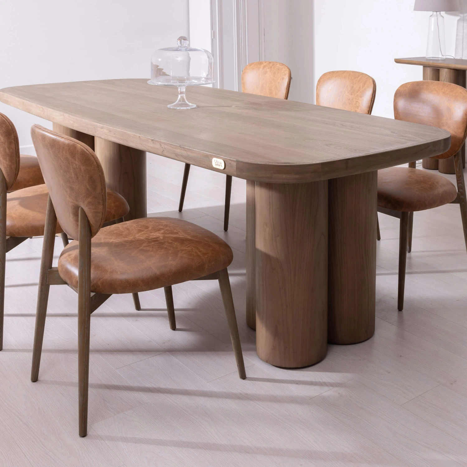 A long 240cm Elm Wood dining table featuring two striking legs that are made up of a cluster of three cylinders adding a distinct character to the table. The table top features a curved edge table top that adds charm and compliments the cylindrical legs adding an organic, smooth shape. The whole table is made from solid elm wood and is embellished with a signature ‘Olivia James’ branding.