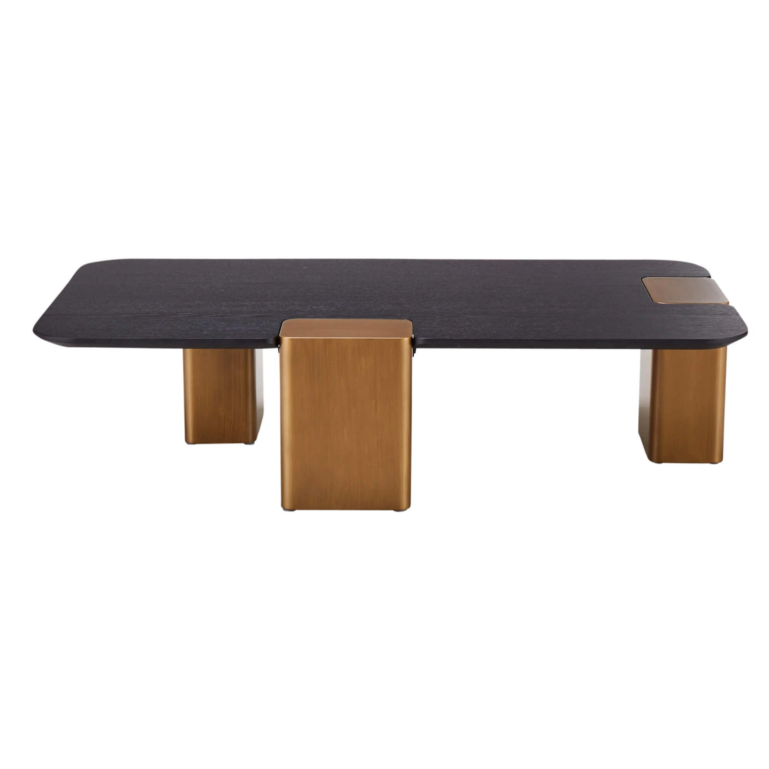 A black coffee table that has a minimalist aesthetic. The bold, intersecting table legs provide support whilst the wonderful matte brass lacquer finish contrasts the black oak veneer top creating a striking visual. The tables soft rounded edges, clean lines and bold style gives the table the feeling of sophistication.