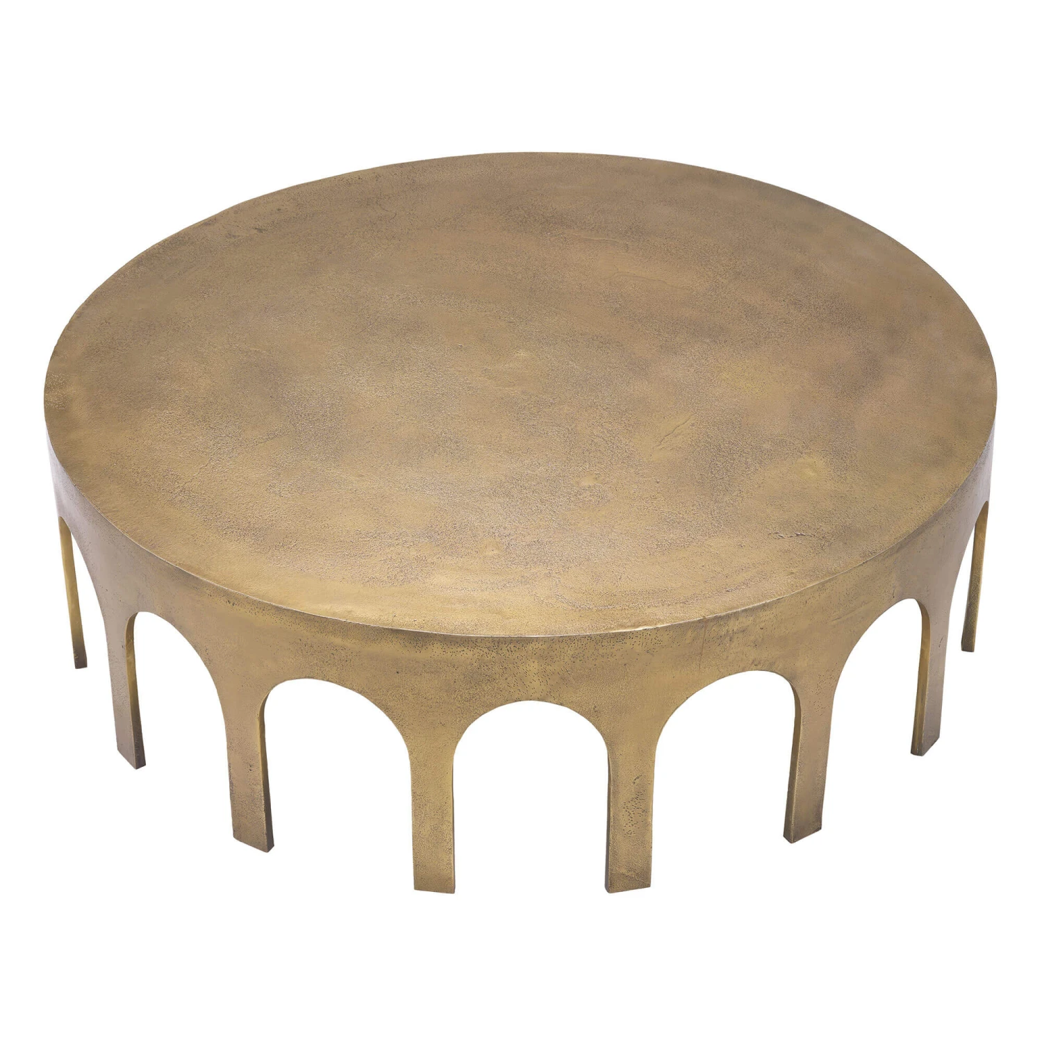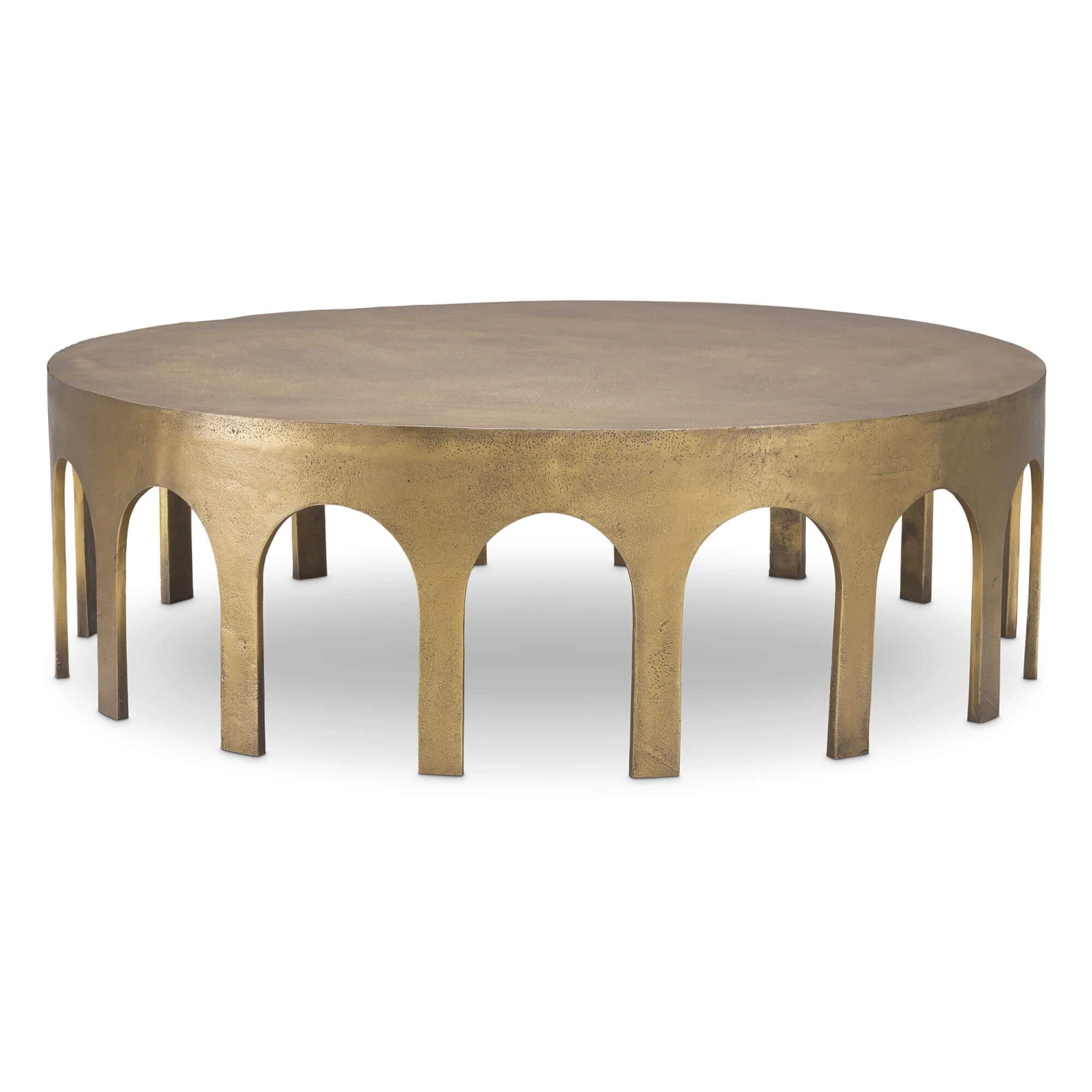 A large coffee table hand crafted by skilled artisans with circular cut out sections around the edging in a vintage brass finish giving a slightly distressed style. The brass finish compliments lots of home décor adding a luxurious focal point to your living space.
