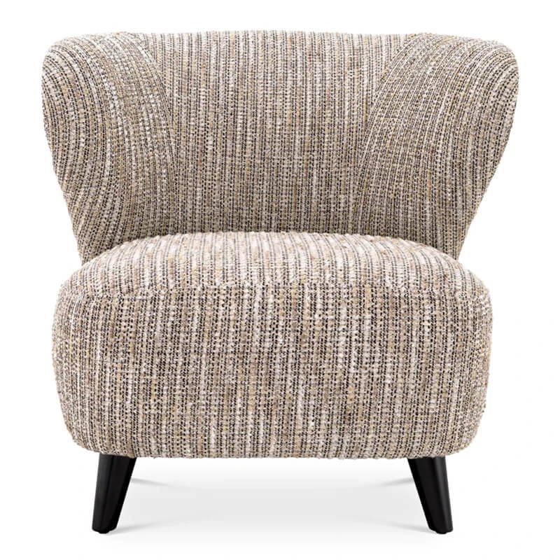A tall wing-back armchair upholstered in a beige fabric that features stripes of black and cream. At the base are 4 cylindrical black feet that connect to the large, cushioned seat that is filled with deep, spongy foam. The chairs seat overhangs the legs creating a layered look.