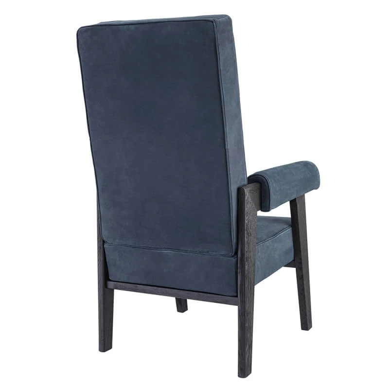 This elegant dining chair chair boasts a striking dark wood frame with a prominent grain, offering a natural yet refined aesthetic. The front legs are subtly angled, contributing to its distinctive design. Adorned with luxurious blue buffalo leather upholstery, this high back chair features a meticulous self-piped edge, highlighting craftsmanship and offers a touch of understated luxury.