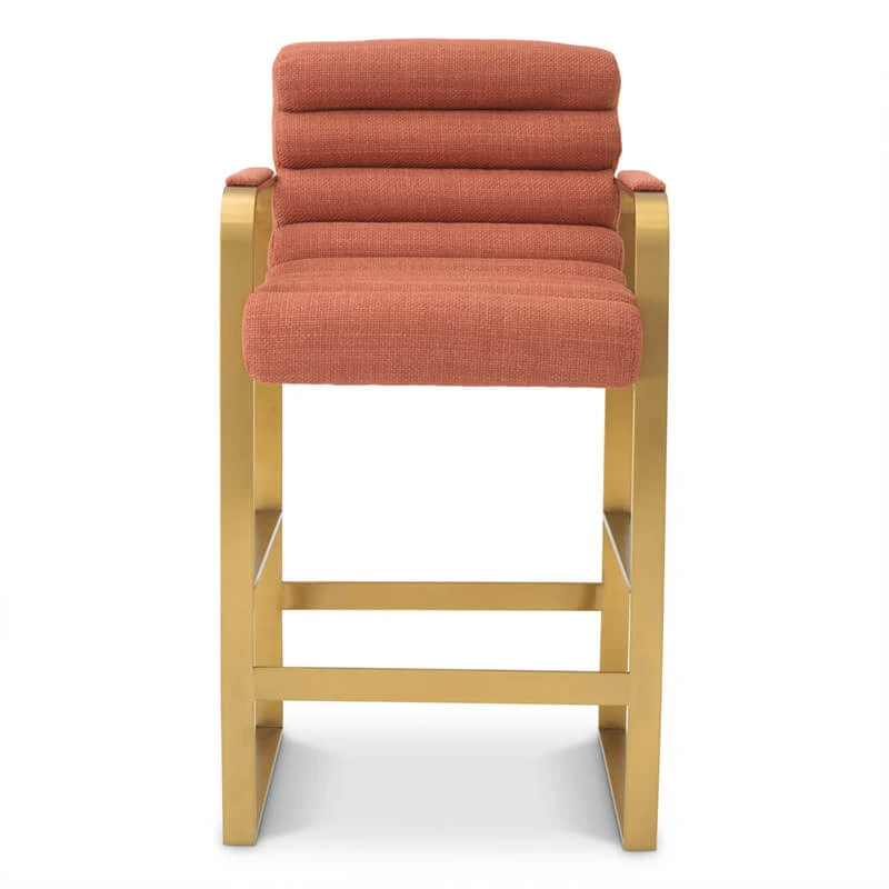 A bar stool that effortlessly captures a mid-century modern aesthetic with a contemporary twist. This sophisticated designer bar stool features plus, horizontal channelling across both the seat and backrest, creating a beautifully cushioned and inviting extrude in a vibrant burnt orange fabric. The warm, rich tone of the upholstery, which appears to be a durable yet tactile woven material, provides an immediate pop of colour, making this an ideal statement kitchen stool for an open-plan living space or stylish modern bar area.