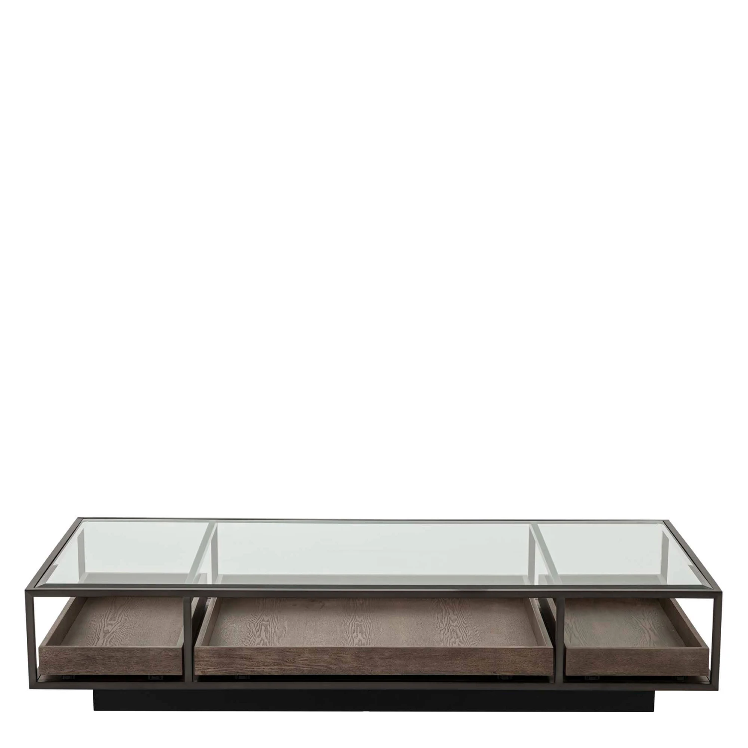Create a striking look in your living room with this hand crafted by skilled artisans display box style coffee table featuring three grey veneer pull-out drawers on rails making your magazines and remotes easily accessible while always clearly visible through the glass top resting on a bronze finish frame.