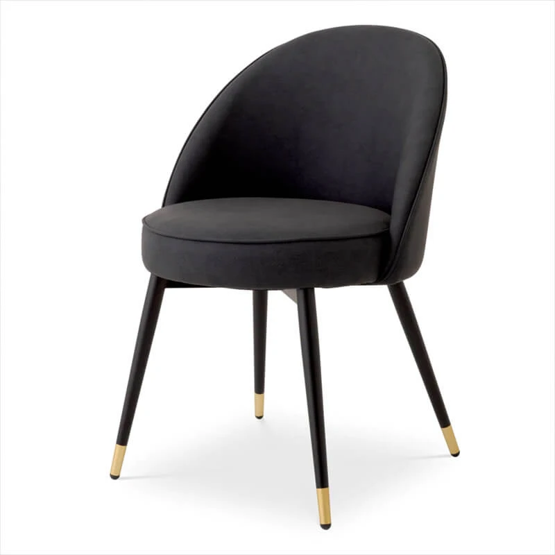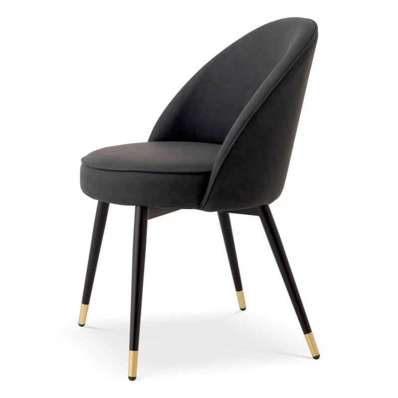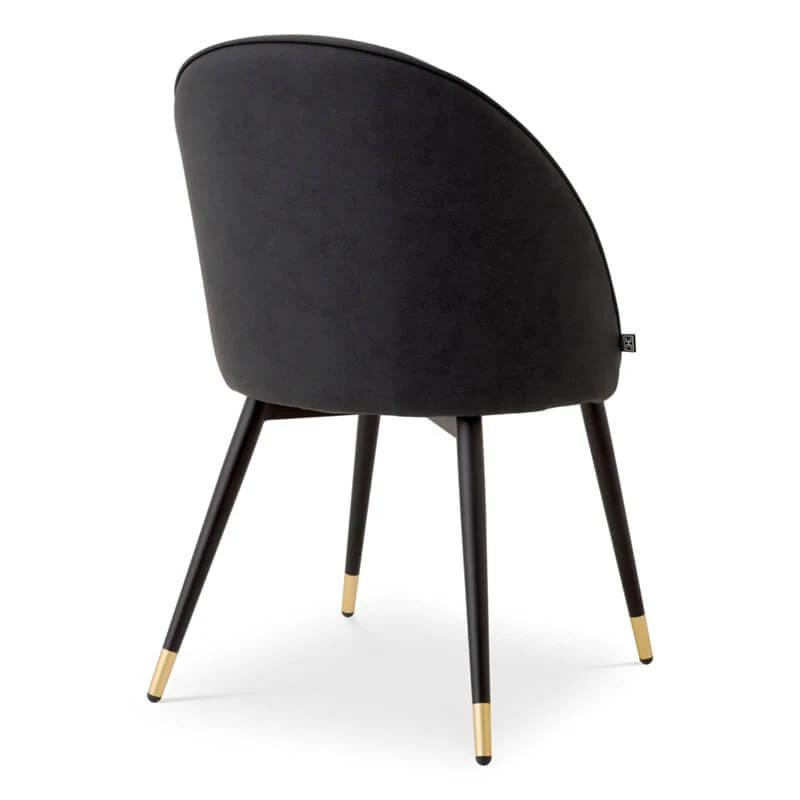A pair of mid-century inspired dining chairs with contemporary flair. The chairs features a shell shaped backrest with matching piped edge that defines the seat and the backrest. At the base are 4 splayed legs that each have a shiny brass cap that accents the black faux-leather upholstery.