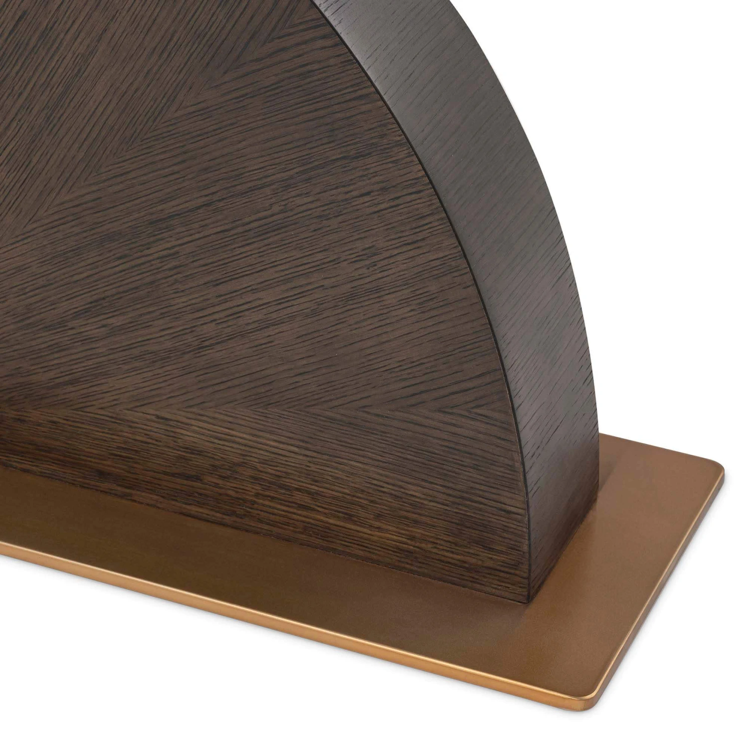 This spring mocha oak console table is hand crafted by skilled artisans made from oak veneer features a slim table top with a tall curved stand all resting on a thin brushed brass finish base. Consoles perfect for in a hall way or living space as a statement piece on its own that can also be styled with accessories.
