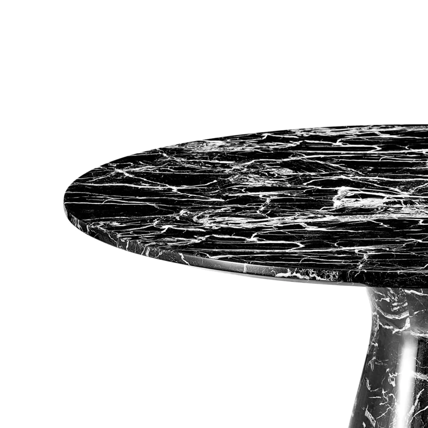 white swirls and veins. The table features a round top and tapered base. This