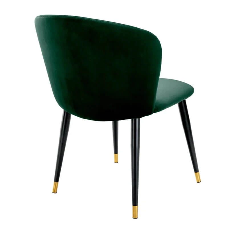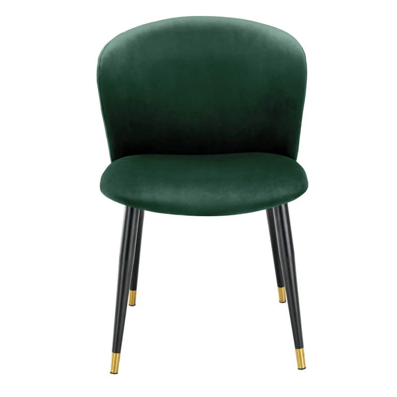 A retro inspired dark green dining chair that features velvet upholstery and four splayed black metal legs that each have gold tip detailing that compliments the green upholstery. The cleverly proportioned seat curves slightly inwards, creating a more ergonomic, comfortable seat.