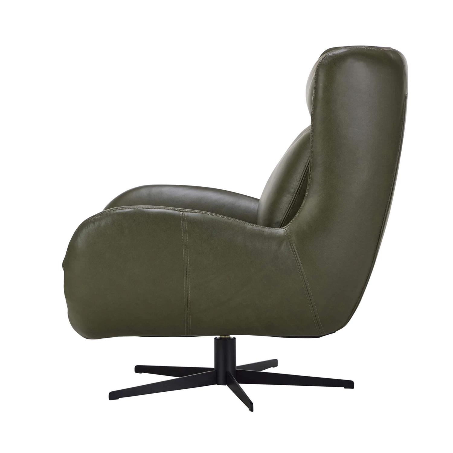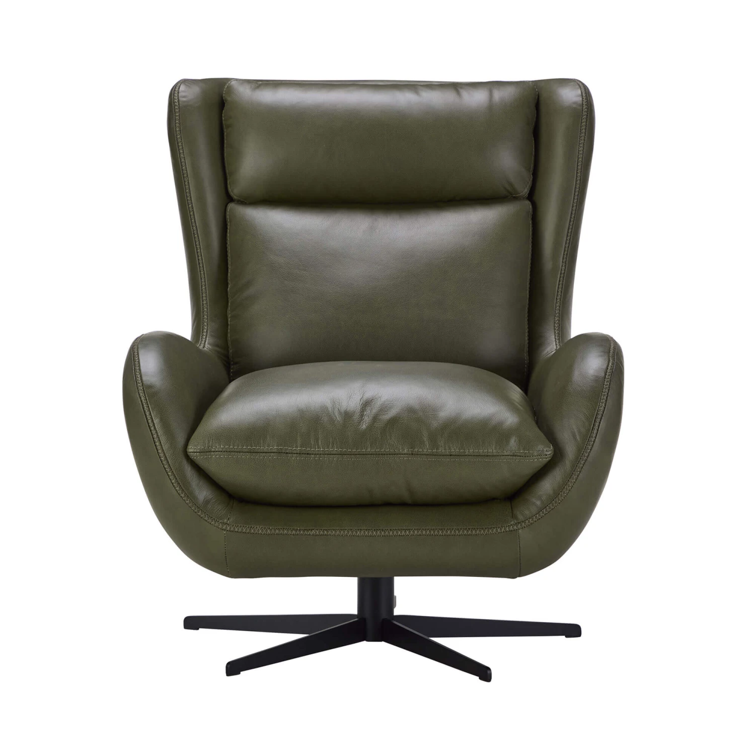 Unwind in extreme comfort and sophisticated style with the Emilio Green Leather Swivel Chair. Upholstered in a rich green leather, the Emilio features a high back design, generously padded pillow-style cushions, curved arms and a black metal swivel base, creating a wonderfully plush and attractive piece.