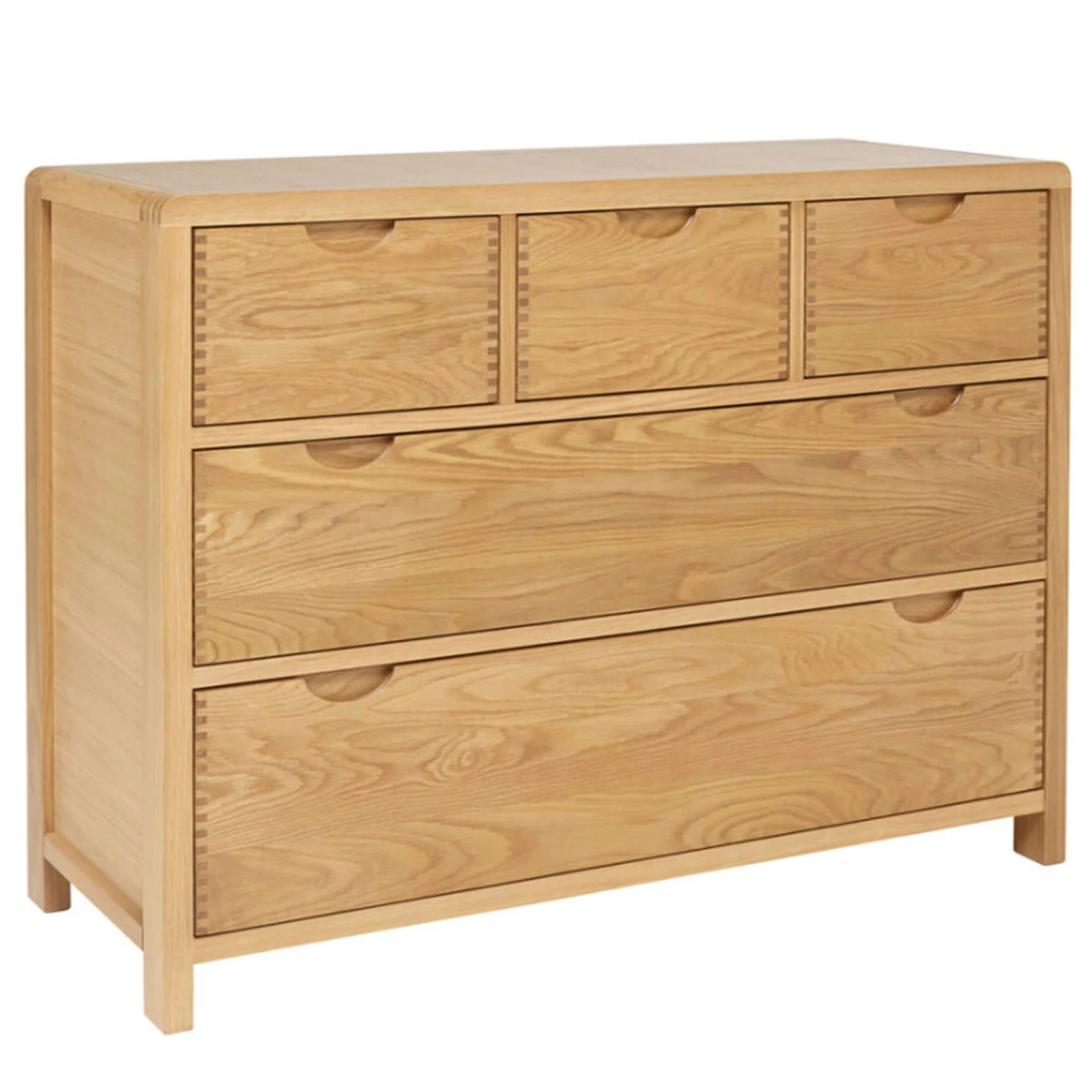 This Bosco 5 Drawer Wide Chest by Ercol features the signature Bosco curved finger joint on the top corners of the chest and finger joint details on all the drawer fronts. This chest features 5 deep drawers allowing you to neatly store away items to keep your bedroom tidy and organized. This chest of drawers will provide your bedroom with an elegant look.
