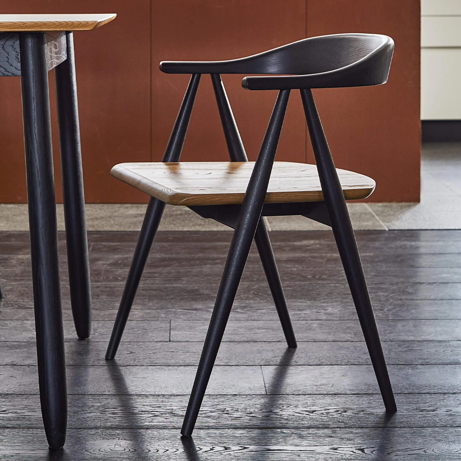 Made by highly skilled craftsmen, who take care and pride in their work. Crafted from high-quality solid oak and ash, sourced worldwide from sustainable forests using genuine, solid patina oak seat with a visible grain for character and texture