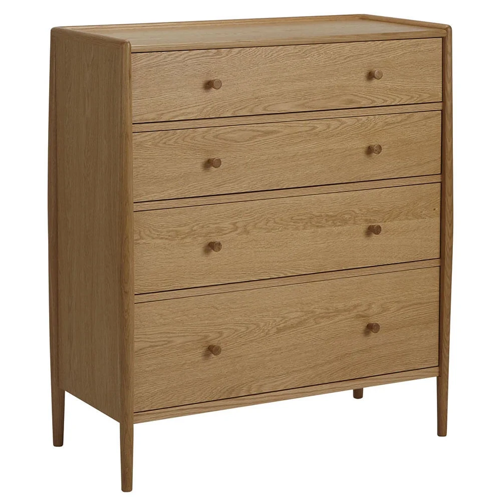 Inspired by Ercol’s mid century style and reinvented for modern homes, the Winslow 4 drawer chest features a minimalist design that will lend a natural and delicate touch to your bedroom. The Winslow 4 drawer chest has been expertly crafted from solid oak and veneers for practicality and durability, finished with a matte lacquer. The design incorporates a non-removable tray-edge top to prevent items from rolling off the sides, with four drawers that are perfect for additional storage. Slender tapered legs elevate the chest and complete the chic, modern aesthetic beautifully.