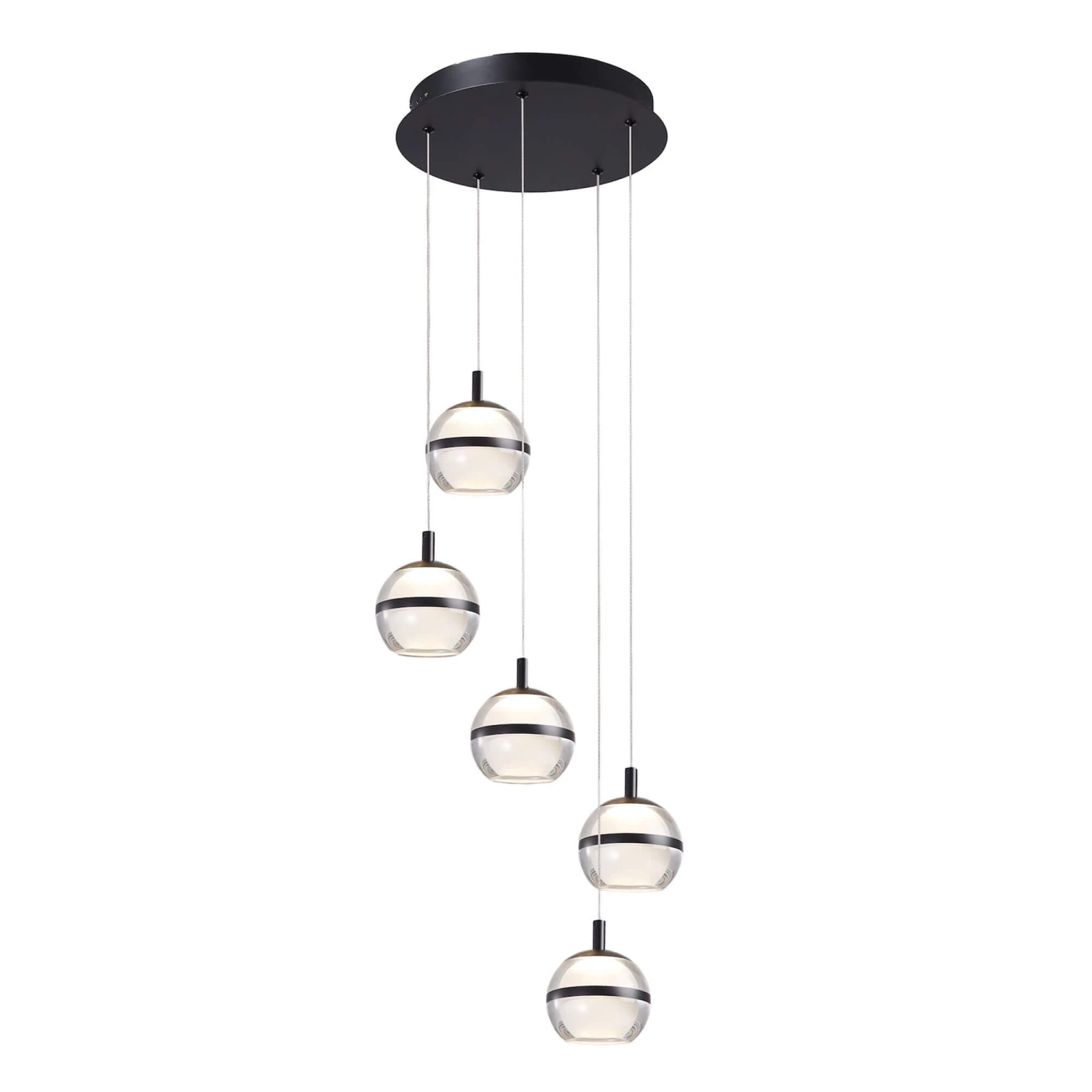 Add a piece of contemporary lighting to your home with this Evenaar Matt Black 5 Light Cluster Pendant. Illuminated by five replaceable LED bulbs, this attractive pendant light features five round clear and frosted glass shades each decorated with a black strip on a round matt black finish base, creating a soft but brilliant glow. Adjustable in height from 25cm to 200cm, this pendant light is conveniently dimmable and perfect for adding a stylish touch to any room with its simple but sophisticated design.