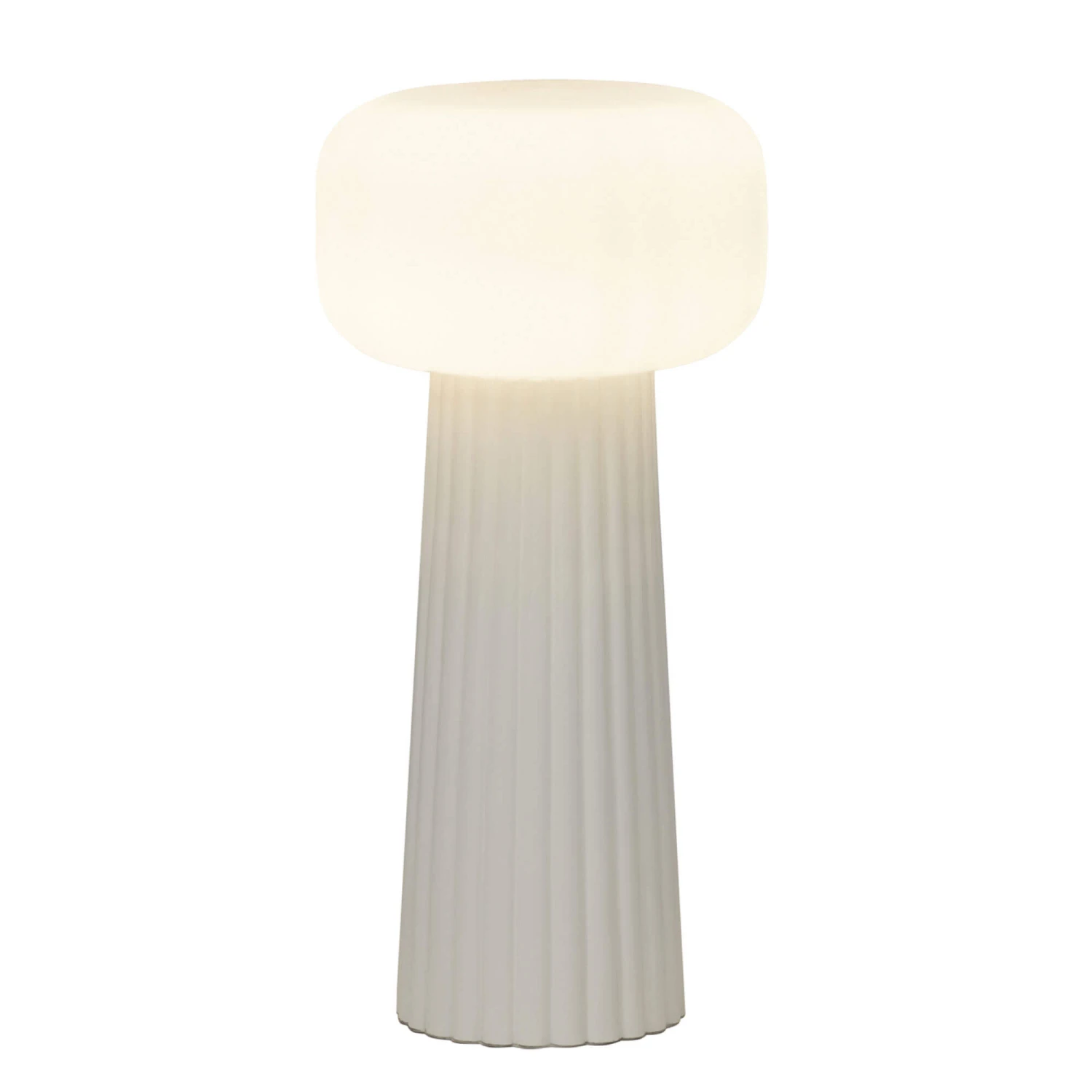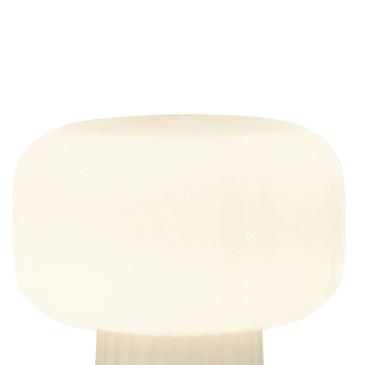 The Faro Blanca White Table Lamp is a modern lamp that will become a stylish, statement piece in your home. Operated by an in-line switch, the smooth, ribbed cone shaped base partnered with the sleek glass shade gives this lamp a sleek look and allows it to stand out in any room.