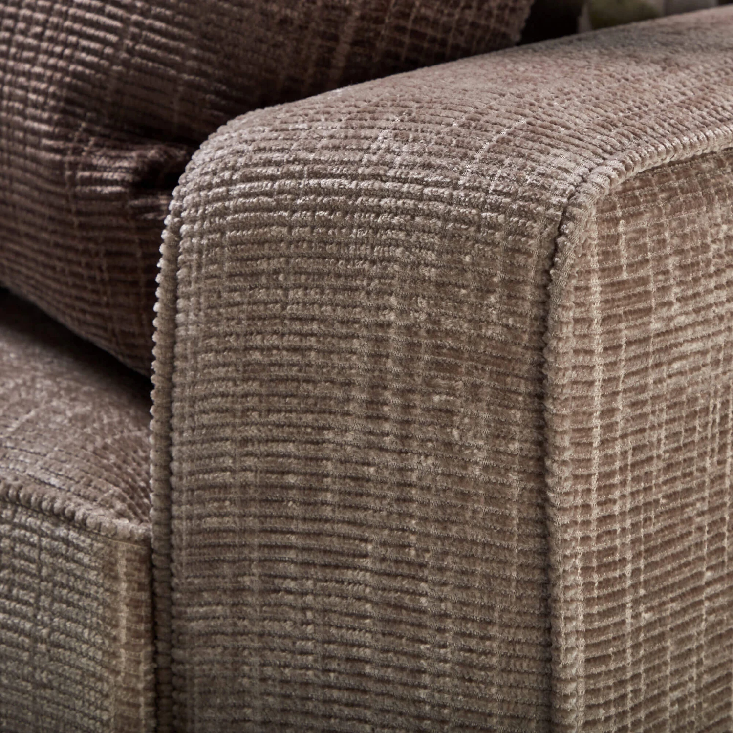 The natural textures and grains of the stunning weathered oak plinth contrast the chenille fabric beautifully, whereas the piped edging along the track arms and seats further enhances the strong, architectural lines and soft, subtle curves that lend this piece its smart look.