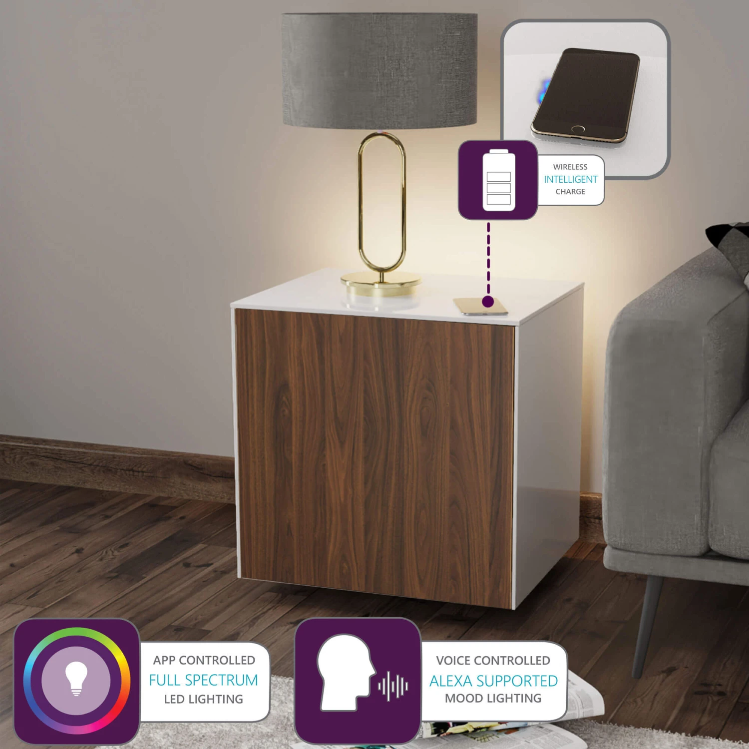 Add subtle mood lighting to your space with the integrated LEDs, situated at the rear of the unit, with ambient, romantic, flashing and colour changing settings. The full colour spectrum light can be controlled either from your phone or tablet via the compatible Smart App or by voice command with Amazon Alexa. The supreme functionality of the side table allows you to set the lights to turn on or off at specific times, remotely over WIFI via the app.