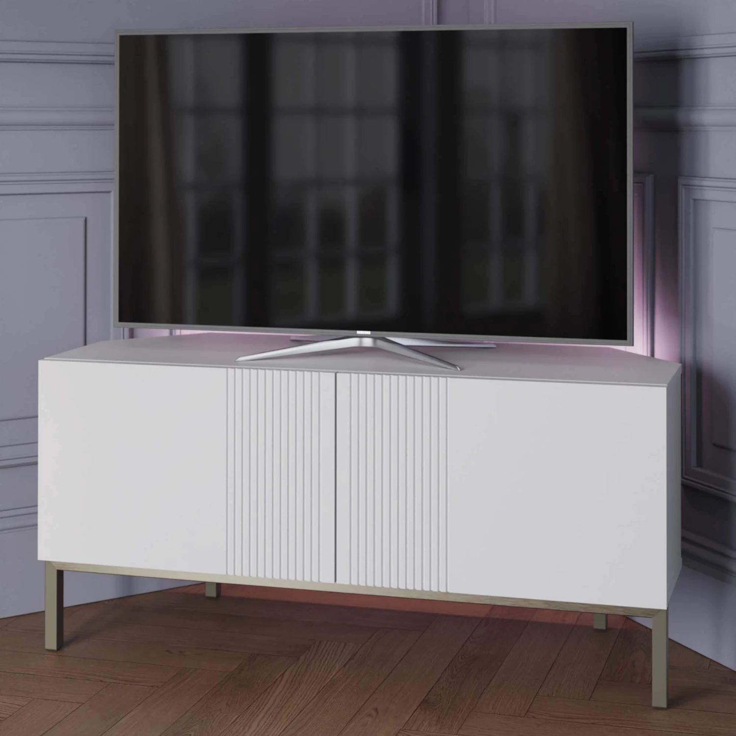 A beautiful two door corner TV Unit with a subtle design, crafted with a corner design to maximise space and comfortably fit into the corner of your living room. Featuring an integrated mobile app and SMART speaker mood lighting. The two interior shelves with cut outs at the back make adding your TV boxes connect easier and tidier.