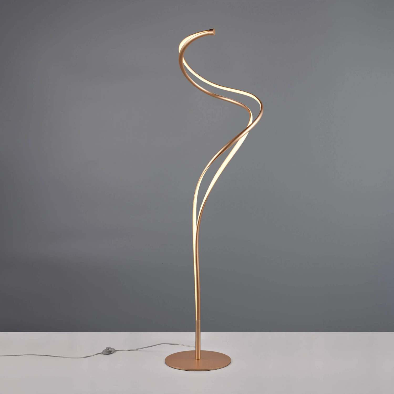 Add an impressively decorative piece to your home with this Frusta Gold Floor Lamp. Illuminated by an integrated LED, this elegant floor lamp features a unique curved design with a round base in a gold finish, combining modern colour and design. Operated by a foot switch, it has an integrated dimmer, adjustable brightness and light colour function, and a convenient memory function to save your last selected light setting. Stunning in design and practical in functionality, this stylish floor lamp will catch the eye of anyone in its presence and is perfect placed in your living room.