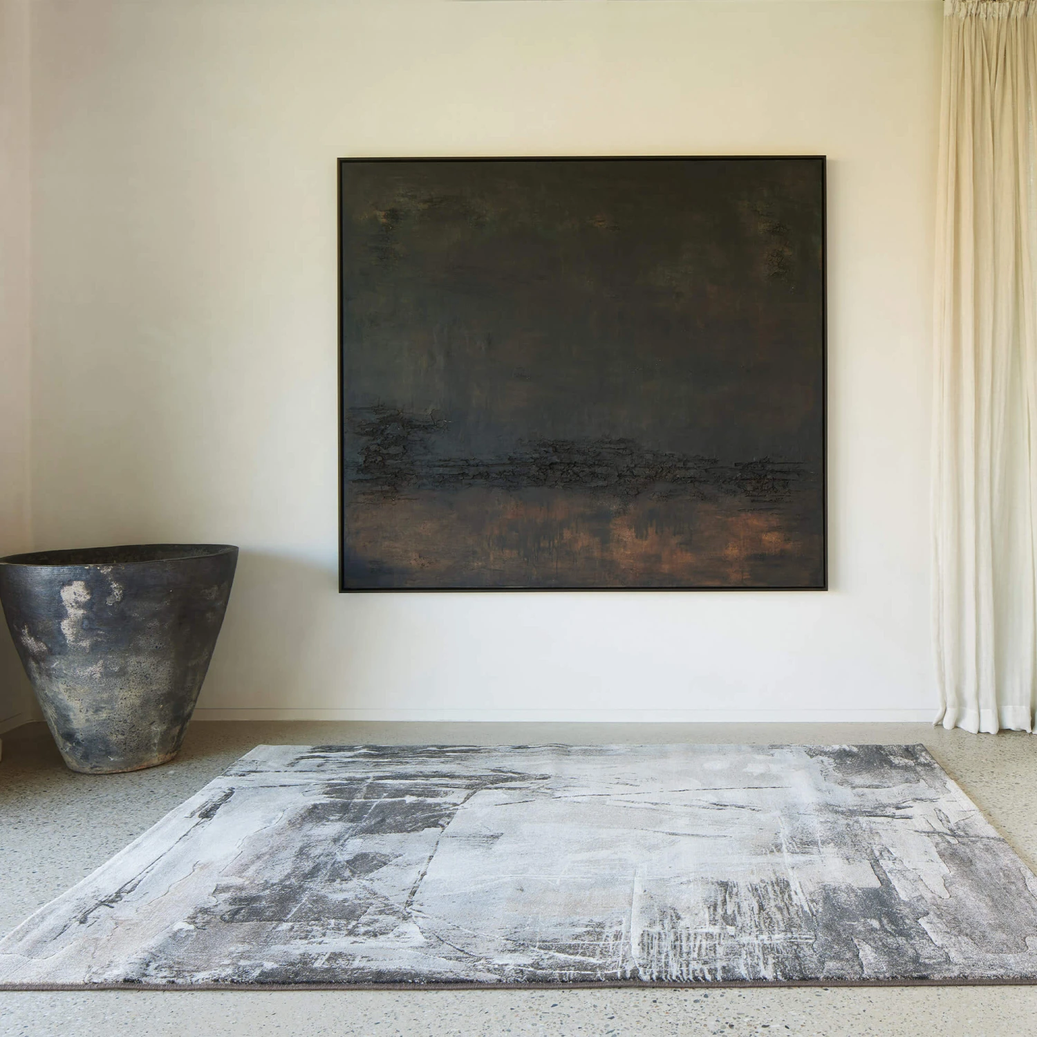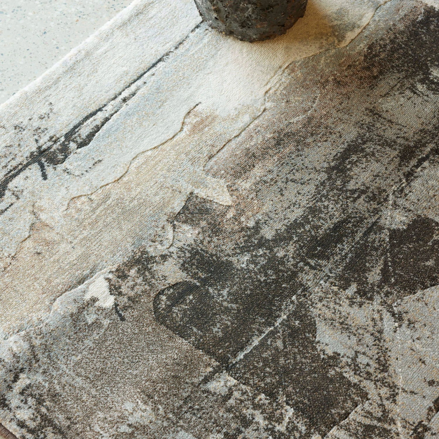 A stunning, abstract rug with luminous black tones, faded greys and rich brows which, when combined, create a striking and dramatic look. The rugs got an a feeling of being a contemporary art work, allowing the feeling of elegance in any space.
