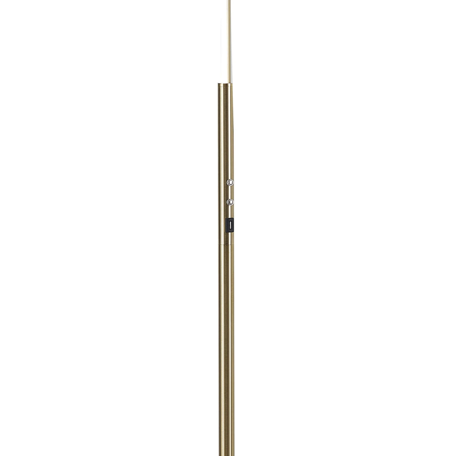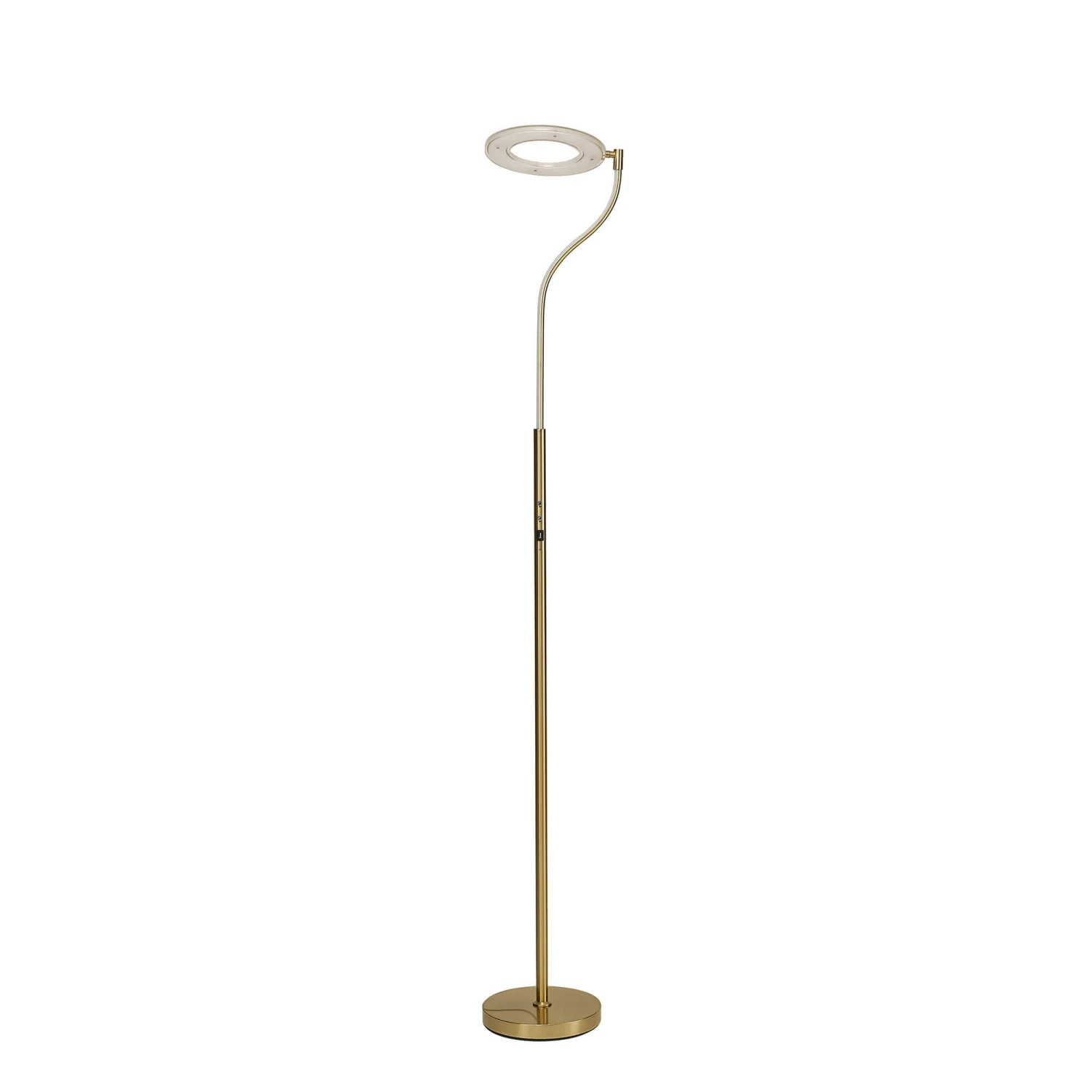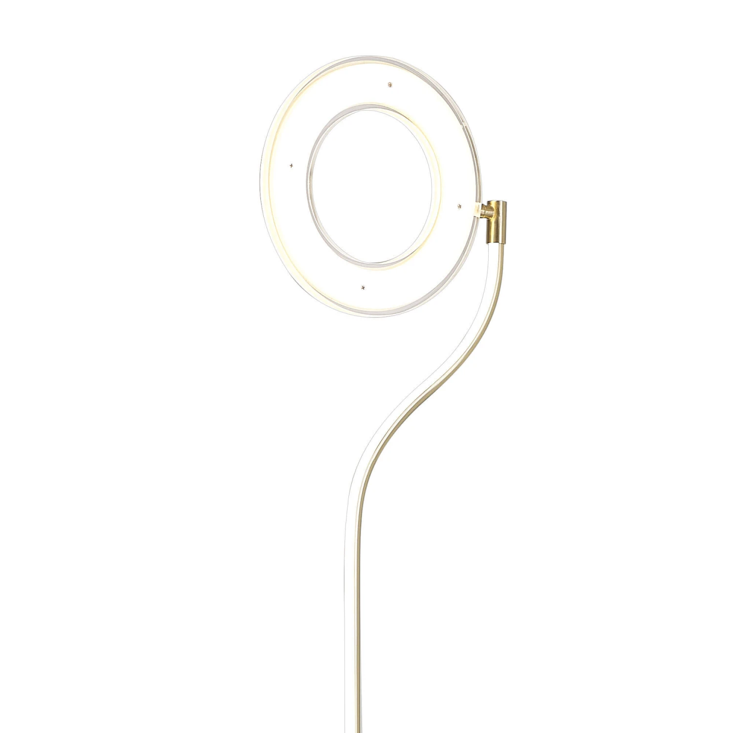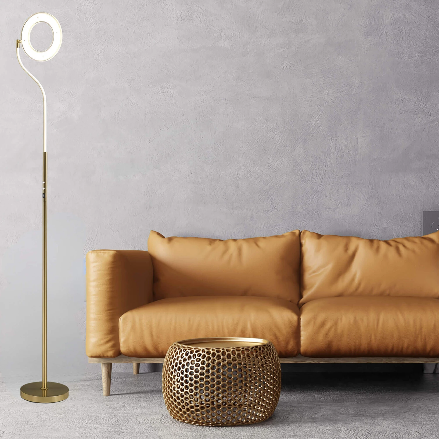 Add an eye-catchingly sleek and modern touch to your home with this Giro Satin Gold USB 2 Light Floor Lamp. Illuminated by two integral LEDs emitting warm white light, this charming floor lamp features a slim satin gold finish stem leading into a halo shaped housing of the integral LEDs. The LED head of the lamp has the ability to pivot, creating uniqueness and exclusively, as well as heighten the control of the lights directionality. Operated by a touch dimmer, it includes a built in USB charging port to further amplify its appeal. Available in two colours, satin gold and satin nickel, this stylish floor lamp is perfect placed in any contemporary bedroom or living room.